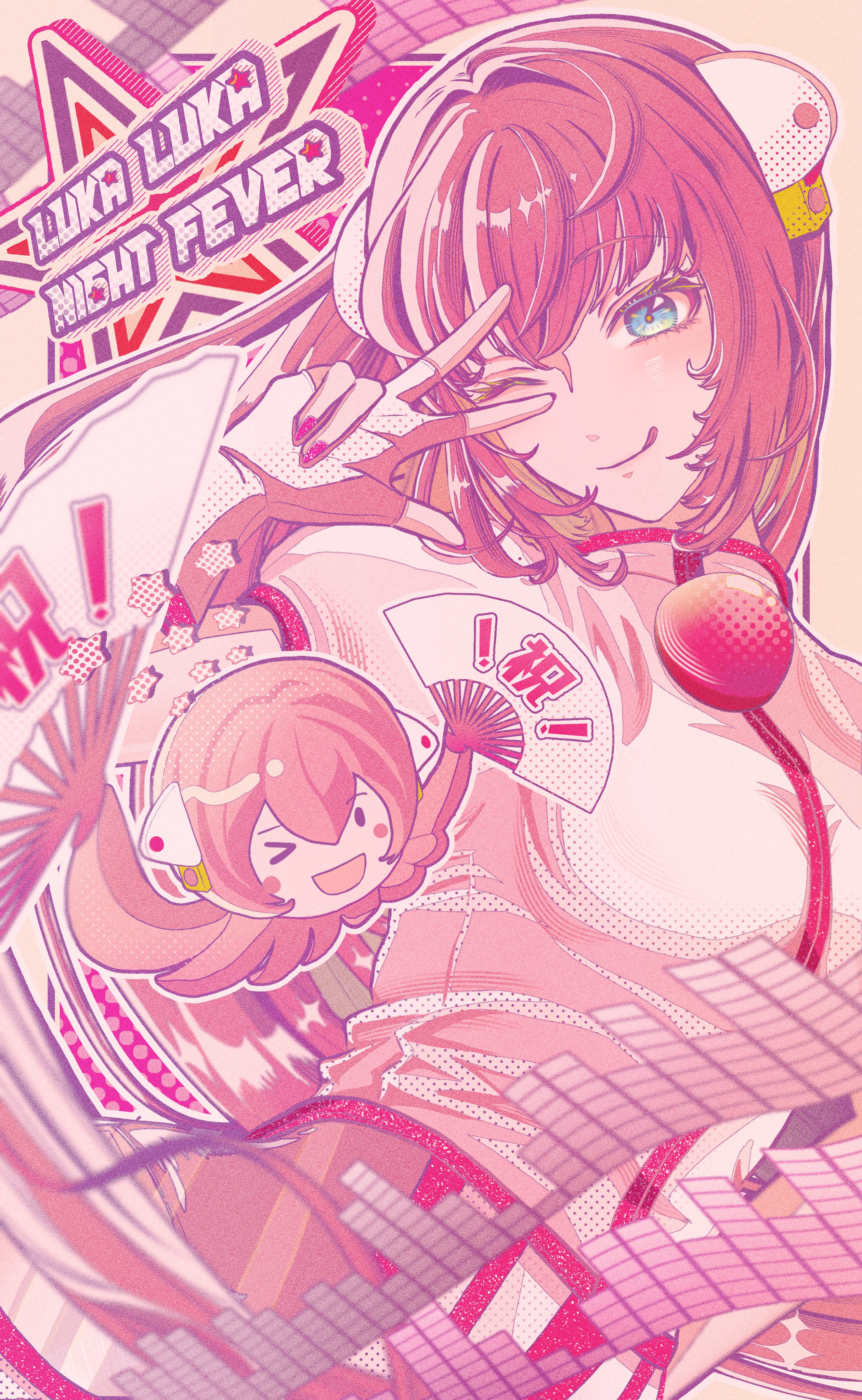 1girl 1other absurdres anniversary blue_eyes blurry commentary_request copyright_name megurine_luka_(cybernation) daysandayo depth_of_field english_text fingerless_gloves gloves hair_intakes hand_fan highres holding holding_fan looking_at_viewer luka_luka_night_fever_(vocaloid) megurine_luka one_eye_closed partial_commentary pink_hair pink_nails project_diva_(series) smile star_(symbol) takoluka tongue tongue_out v v_over_eye vocaloid