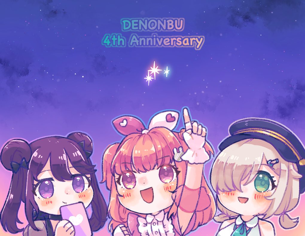 3girls :d anniversary arm_up black_hat bow chibi collared_shirt commentary_request copyright_name denonbu double_bun gloves green_eyes hair_bow hair_bun hair_over_one_eye hat holding holding_phone iduru126 index_finger_raised inubousaki_shian minakami_hina multiple_girls official_alternate_costume official_alternate_hairstyle open_mouth peaked_cap phone pink_eyes pink_hair purple_eyes purple_hair purple_sky sakurano_mimito shirt short_hair sky smile star_(symbol) twintails two_side_up upper_body white_gloves white_shirt