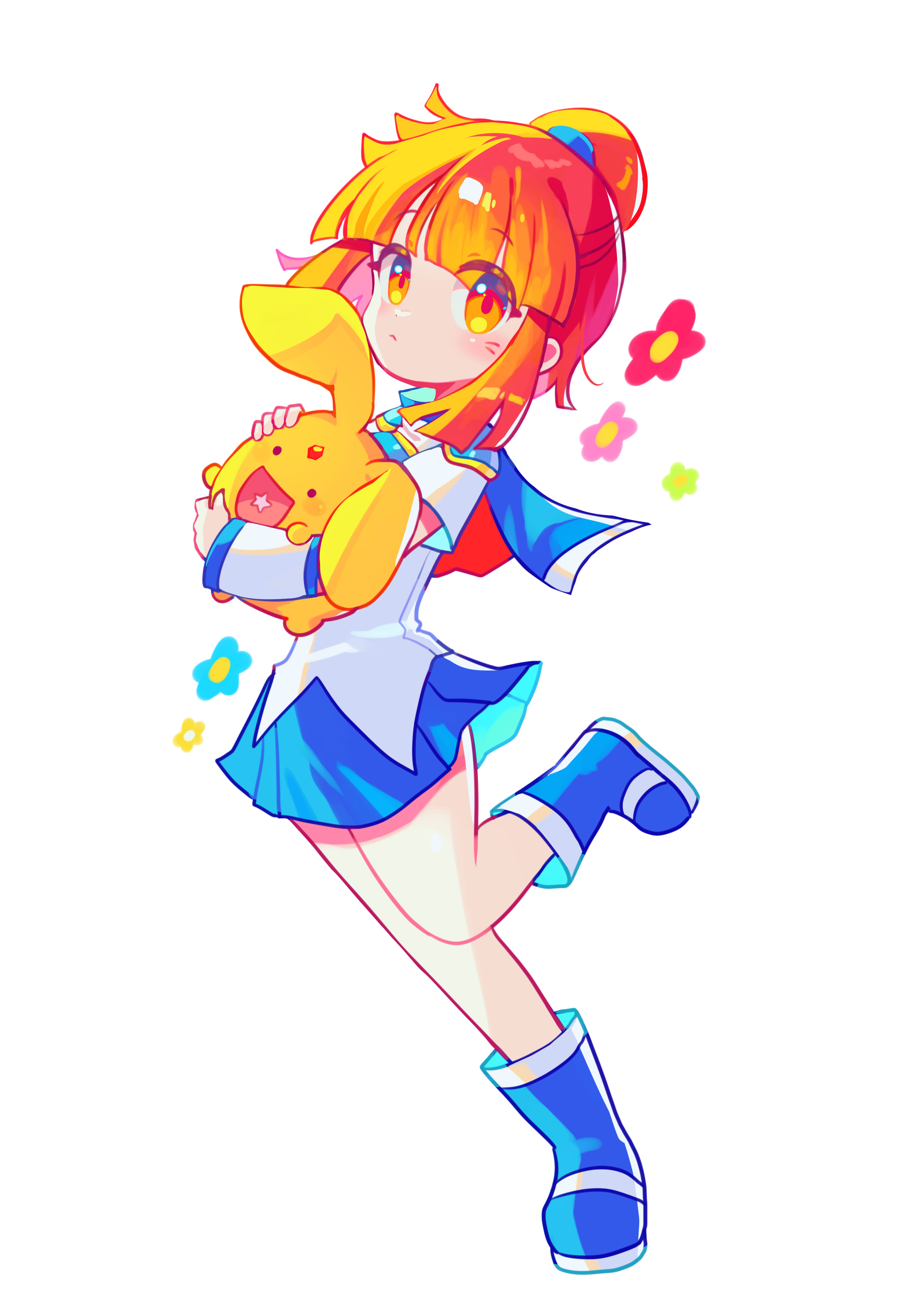 1girl absurdres arle_nadja blue_boots blue_capelet blue_skirt boots capelet carbuncle_(puyopuyo) closed_mouth full_body high_ponytail highres holding holding_stuffed_toy legs looking_at_viewer medium_hair offbeat orange_eyes orange_hair ponytail puyopuyo shirt short_sleeves simple_background skirt solo standing standing_on_one_leg star_(symbol) stuffed_toy thighs white_background white_shirt white_trim