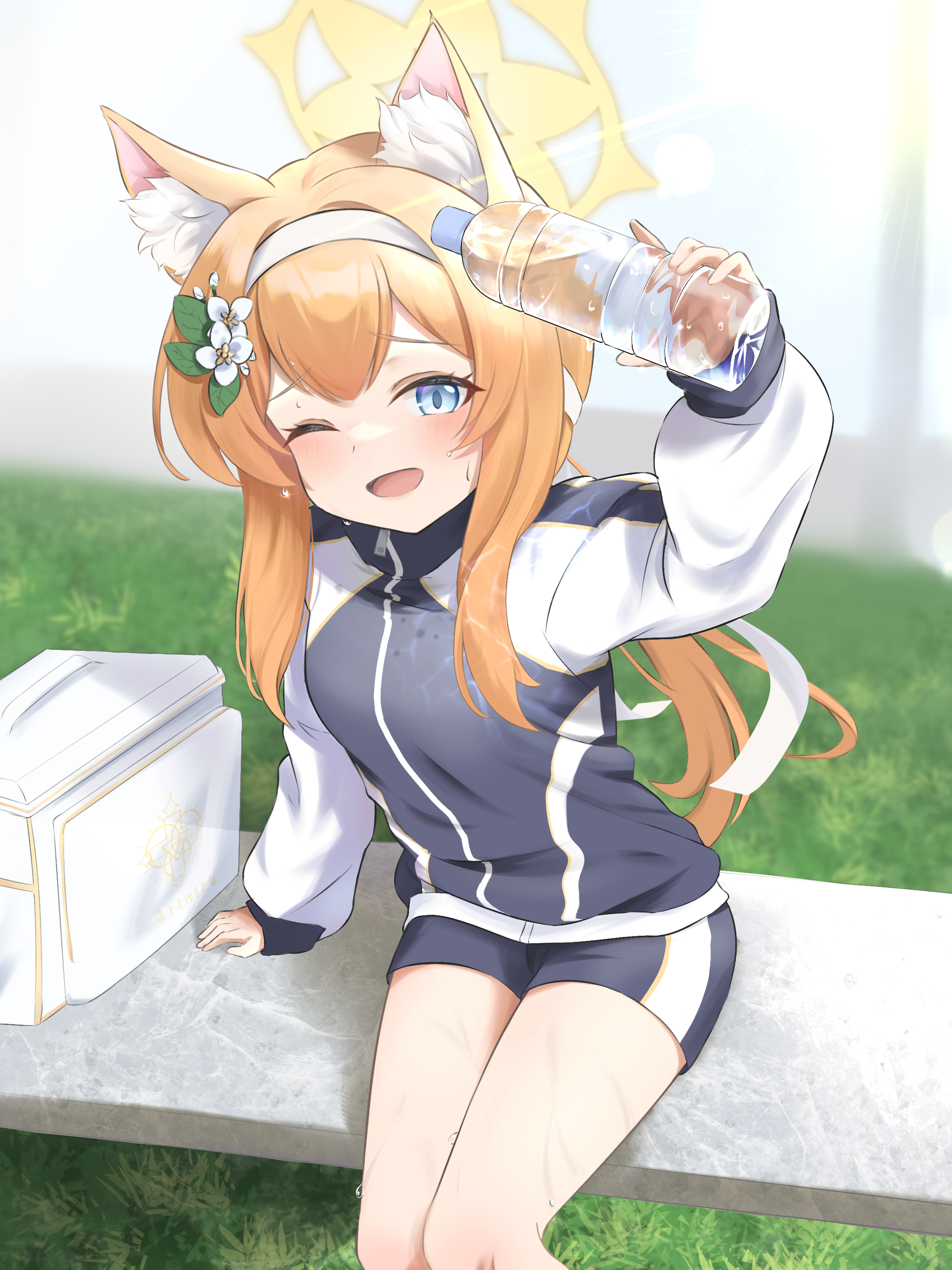 1girl ;d absurdres animal_ear_fluff animal_ears arm_support black_shorts blue_archive blue_eyes bottle cat_ears cat_girl commentary_request cooler flower from_above grass gym_shorts gym_uniform hair_between_eyes hair_flower hair_ornament halo headband highres holding holding_bottle jacket leaning_to_the_side long_hair long_sleeves looking_at_viewer low_ponytail mari_(blue_archive) mari_(track)_(blue_archive) official_alternate_costume official_alternate_hairstyle on_bench one_eye_closed open_mouth orange_hair plastic_bottle ponytail short_shorts shorts sidelocks sitting smile solo sunlight sweat toushitukata_7 track_jacket water_bottle