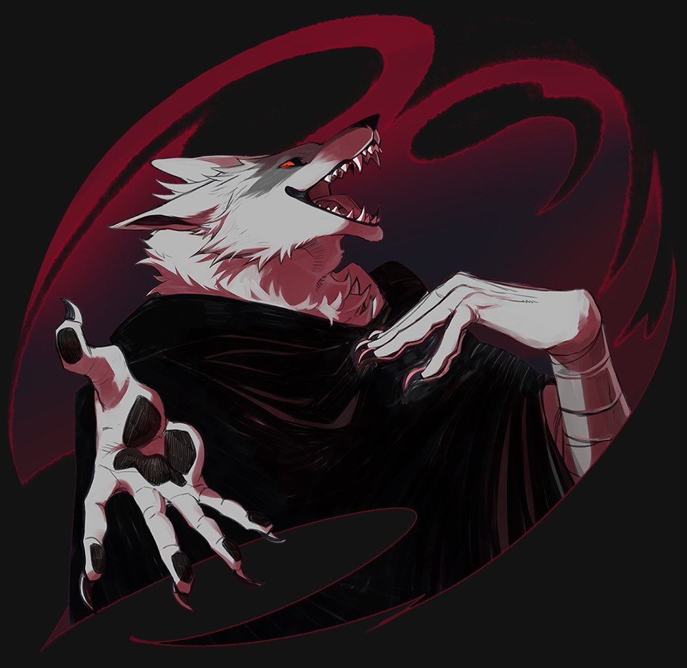 1boy 88_(h_rock_88) animal_ears arm_wrap black_background black_cloak black_nails body_fur claws cloak cropped_torso death_(puss_in_boots) furry furry_male grey_fur hand_on_own_chest looking_at_viewer male_focus open_mouth outstretched_arm pawpads puss_in_boots:_the_last_wish reaching reaching_towards_viewer red_eyes sharp_teeth shrek_(series) slit_pupils smile solo teeth upper_body wolf_boy wolf_ears