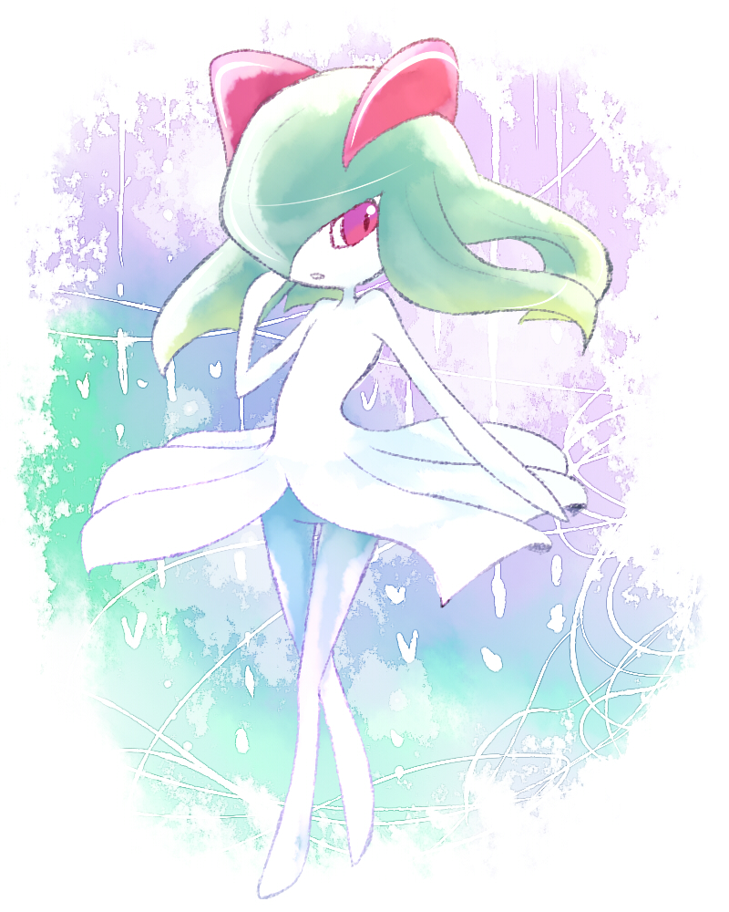 colored_skin gen_3_pokemon gradient_background green_hair green_skin hair_over_one_eye hand_on_own_cheek hand_on_own_face horns kirlia looking_at_viewer multicolored_skin nintendo parted_lips pink_eyes pokemon pokemon_(creature) shinonome_kia sidelocks two-tone_skin white_skin