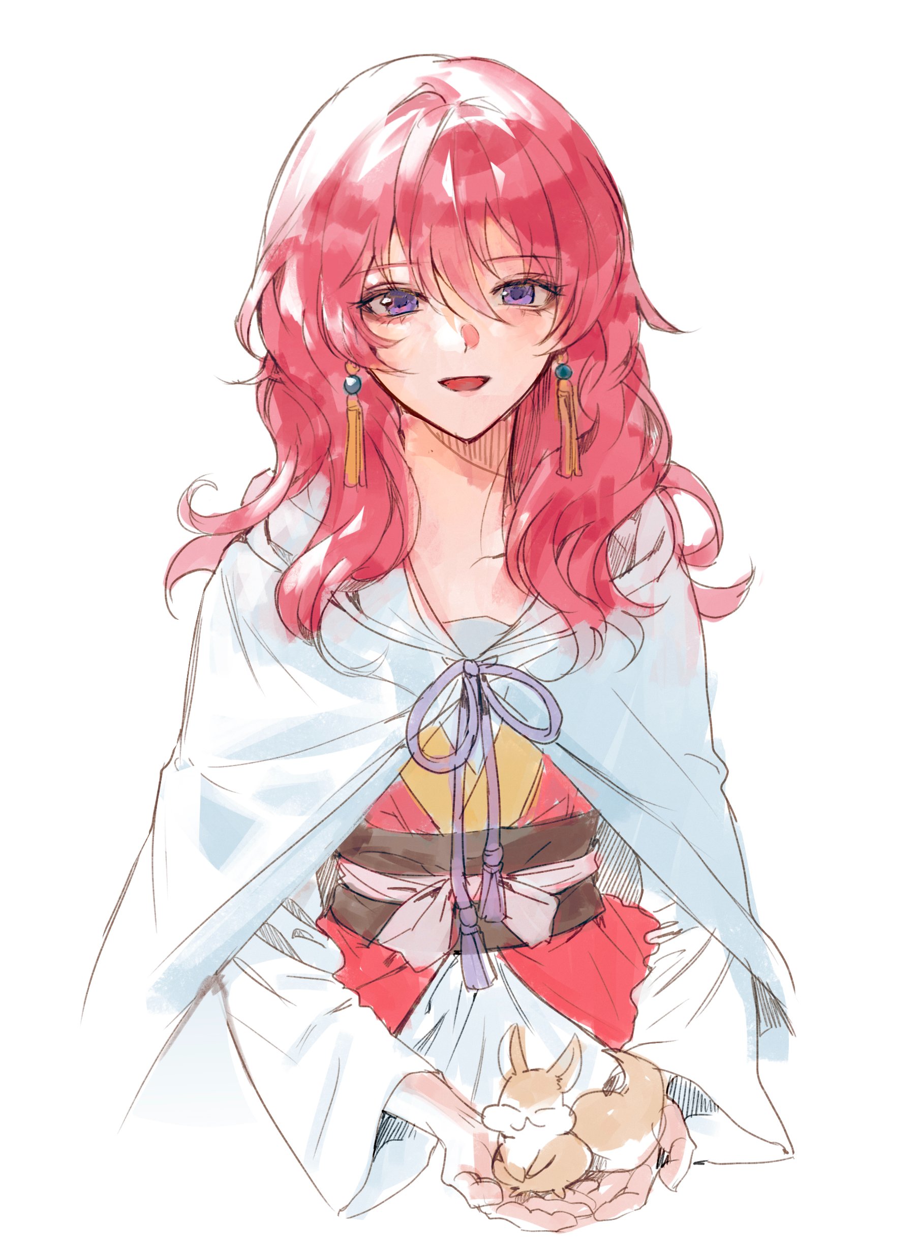 1girl absurdres akatsuki_no_yona animal ateli_er cape commentary cupping_hands dress earrings hair_between_eyes hashtag-only_commentary highres holding holding_animal jewelry long_hair long_sleeves looking_at_viewer open_mouth own_hands_together pink_dress purple_eyes red_hair sash simple_background smile solo squirrel tassel tassel_earrings upper_body white_background white_cape yona_(akatsuki_no_yona)