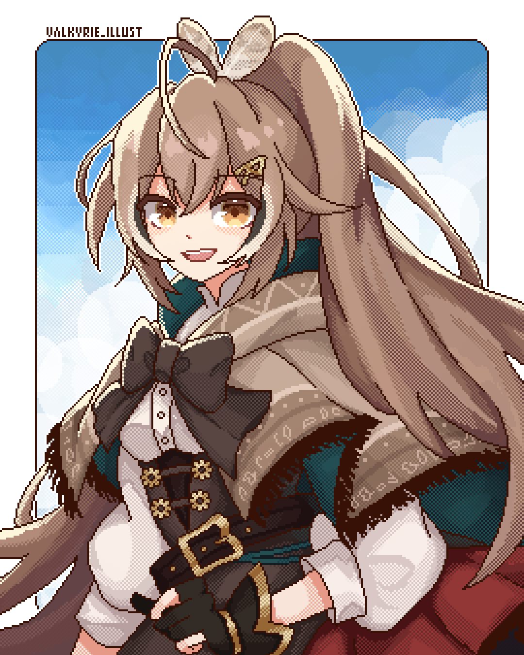 :d ahoge belt brown_capelet brown_cloak brown_corset brown_eyes brown_hair capelet cloak cloud cloudy_sky corset crossed_bangs dithering feather_hair_ornament feathers gloves hair_between_eyes hair_ornament hieroglyphics highres hololive hololive_english long_hair looking_at_viewer multicolored_hair nanashi_mumei nanashi_mumei_(1st_costume) open_mouth partially_fingerless_gloves pixel_art pleated_skirt ponytail red_skirt ribbon shirt skirt sky smile streaked_hair teeth upper_body upper_teeth_only valkyrie_illust very_long_hair virtual_youtuber white_shirt