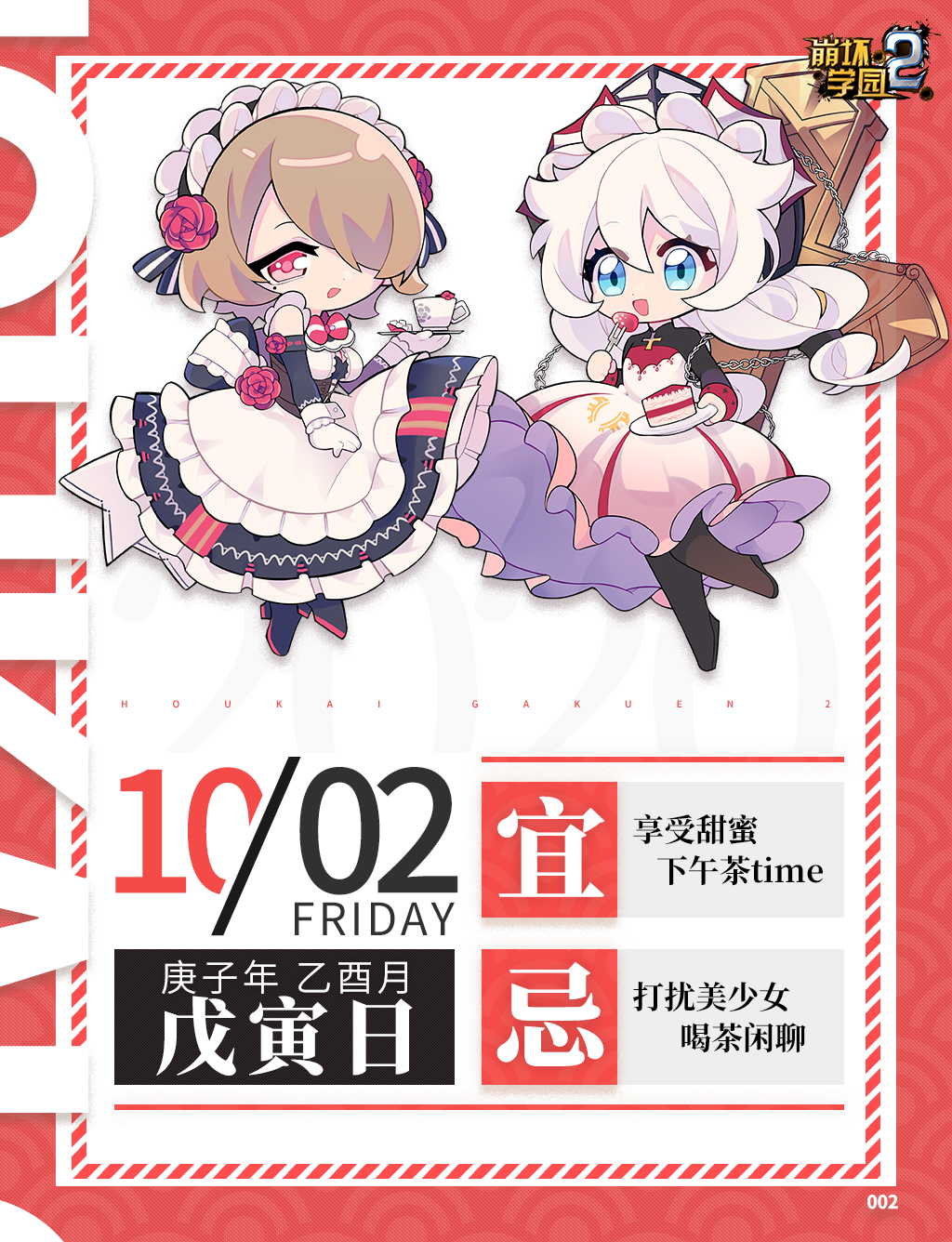 2girls blue_eyes brown_hair cake chibi copyright_name cup eating flower food fork hair_flower hair_ornament hair_over_one_eye highres holding holding_fork holding_plate honkai_(series) honkai_gakuen logo long_hair maid maid_headdress multiple_girls nun oath_of_judah official_art one_eye_covered pink_hair plate red_flower rita_rossweisse second-party_source theresa_apocalypse theresa_apocalypse_(benghuai_xueyuan) theresa_apocalypse_(honkai_gakuen) white_hair