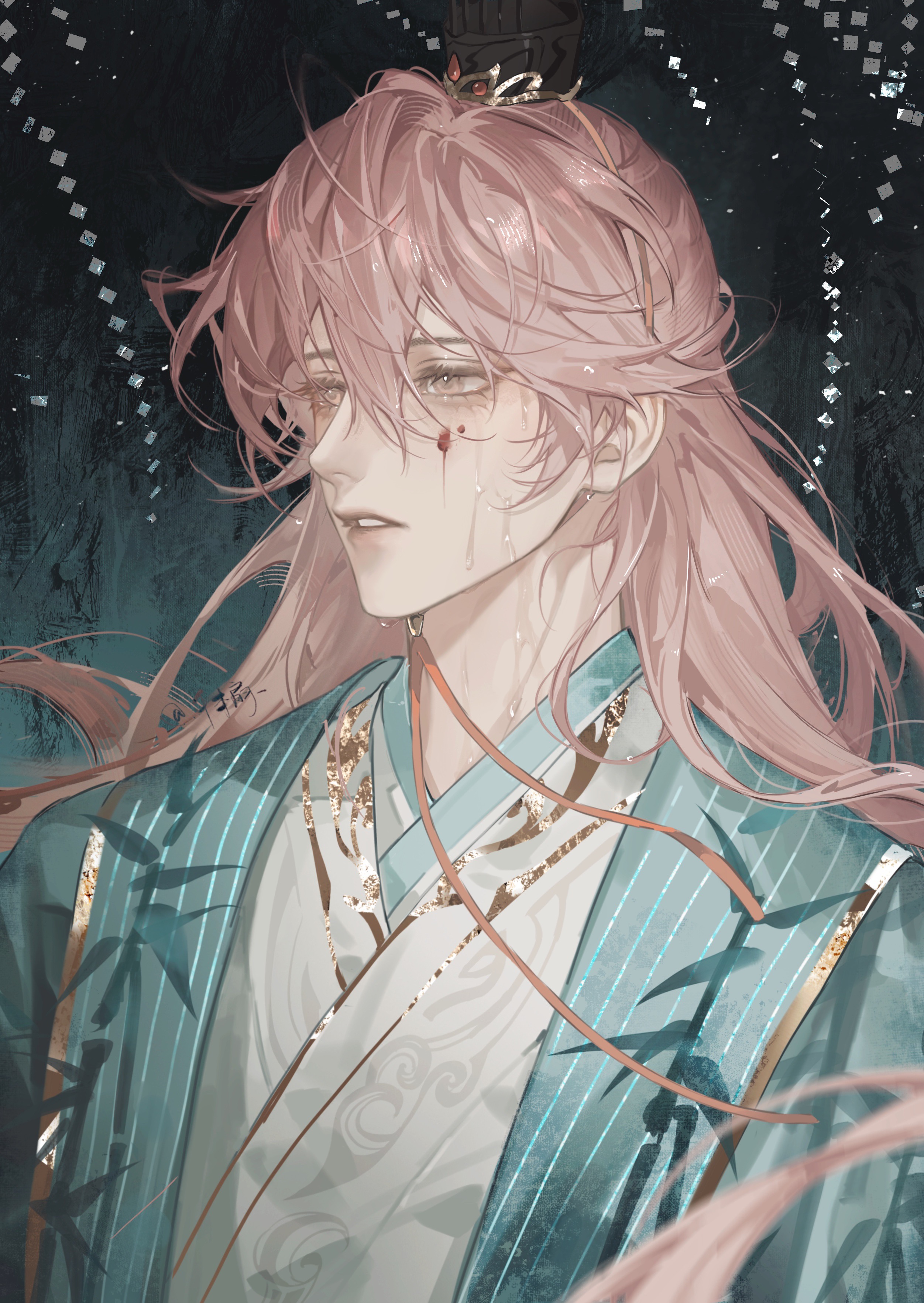 1boy absurdres blood blood_on_face blue_hanfu blurry chinese_clothes code:_kite eyelashes hair_between_eyes hair_ornament hanfu highres lips long_hair looking_afar male_focus parted_lips pink_hair qianben_shan sidelocks solo upper_body water_drop wet yuan_ji