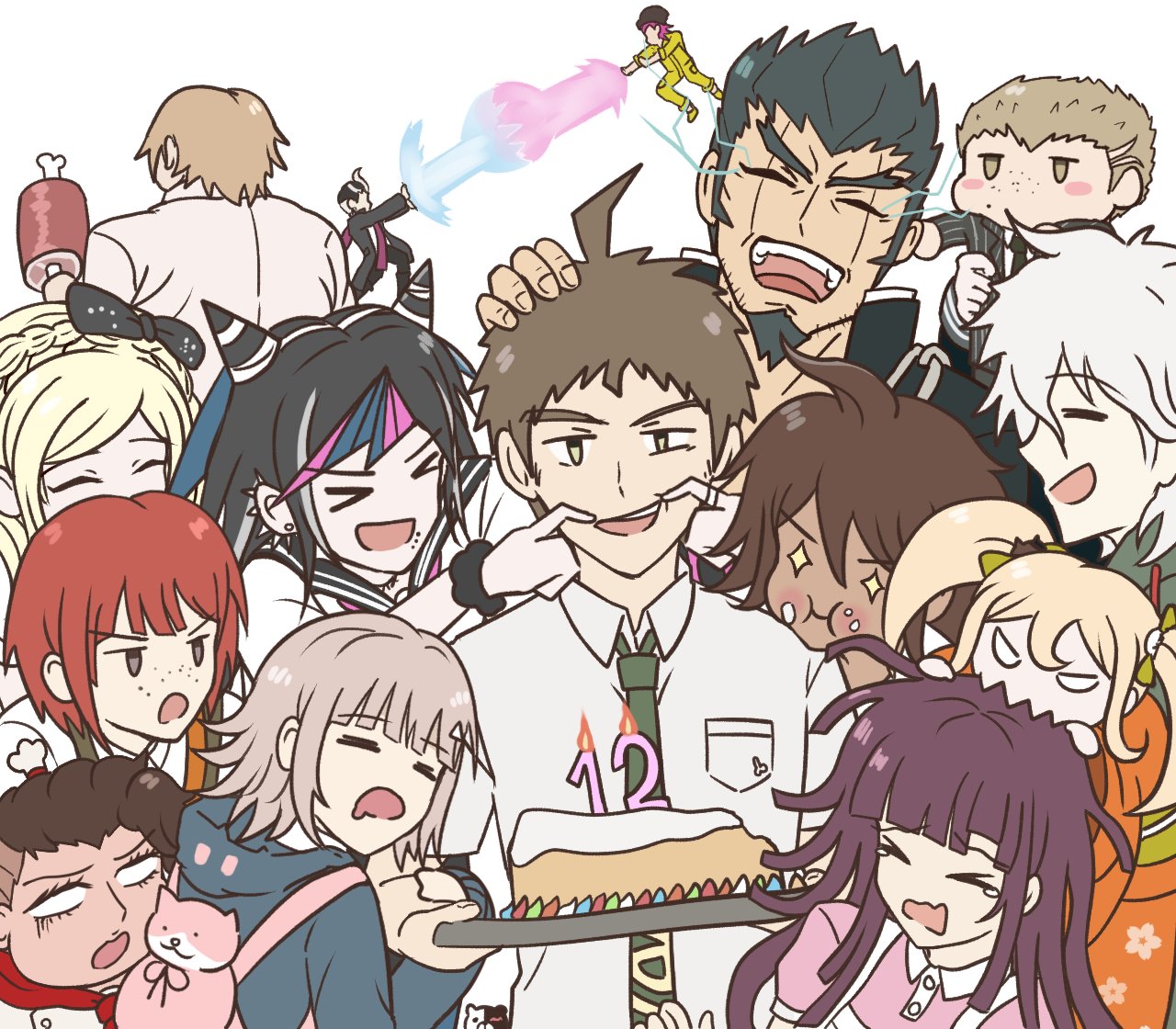 6+boys 6+girls animal_bag black_bow bow breast_pocket brown_hair cake cat_bag collared_shirt danganronpa_(series) danganronpa_2:_goodbye_despair drooling energy_beam everyone facial_hair fighting finger_in_another's_mouth food freckles goatee hair_bow hair_horns hair_ornament hanamura_teruteru hinata_hajime holding holding_cake holding_food hood hood_down jacket kamukura_izuru kmnm_1403 koizumi_mahiru komaeda_nagito kuzuryu_fuyuhiko long_hair long_sleeves looking_at_viewer medium_hair mioda_ibuki multiple_boys multiple_girls nanami_chiaki nidai_nekomaru open_clothes open_mouth owari_akane pekoyama_peko pink_bag pink_eyes pocket ribbon saionji_hiyoko shirt short_hair sleeping smile soda_kazuichi sonia_nevermind tanaka_gundham teeth togami_byakuya_(danganronpa_2) tsumiki_mikan upper_teeth_only white_shirt