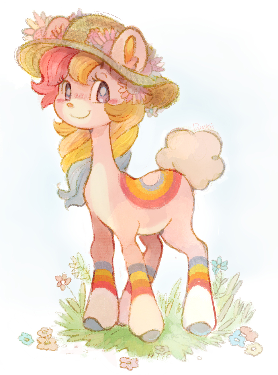 animal animal_focus blush commentary doekis english_commentary flower full_body giraffe grass hat hat_flower highres hooves kissy_(doekis) looking_at_viewer no_humans original sketch smile standing sun_hat tail white_background yume_kawaii