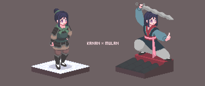 2girls armor black_footwear black_hair blue_shirt boots bracer breastplate brown_background brown_pants brown_shirt character_name chinese_armor chinese_clothes clenched_hand closed_mouth cosplay crossdressing crossdressing_(ftm) disney dual_persona expressionless fa_mulan_(disney) fa_mulan_(disney)_(cosplay) fighting_stance green_scarf grey_pants hair_bun hand_on_own_hip hanfu holding holding_sword holding_weapon knee_boots long_hair long_sleeves love_live! love_live!_sunshine!! matsuura_kanan mulan_(movie) multiple_girls outstretched_arm pants pink_sash pixel_art puffy_long_sleeves puffy_pants puffy_sleeves purple_eyes rooftop ruqun sash scarf shirt short_hair shoulder_pads simple_background single_hair_bun snow standing straight_hair sword updo waist_sash weapon wuxia yuurashia