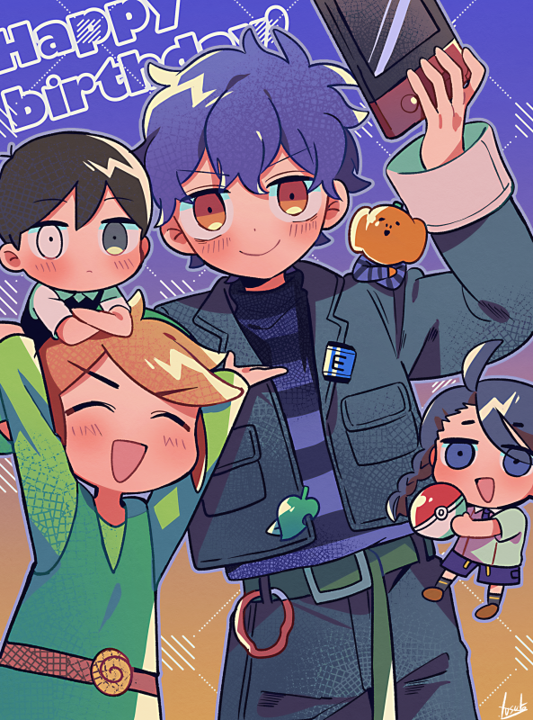 4boys black_eyes black_hair black_sweater_vest blue_hair blush brown_eyes brown_hair character_request chibi closed_eyes closed_mouth collared_shirt copyright_request english_text happy_birthday holding holding_poke_ball jack-o'_ran-tan link looking_at_viewer multiple_boys napoli_no_otokotachi nintendo omori open_mouth poke_ball pokemon shirt short_hair short_sleeves smile spoilers sunny_(omori) sweater_vest the_legend_of_zelda white_shirt yuusuke-kun