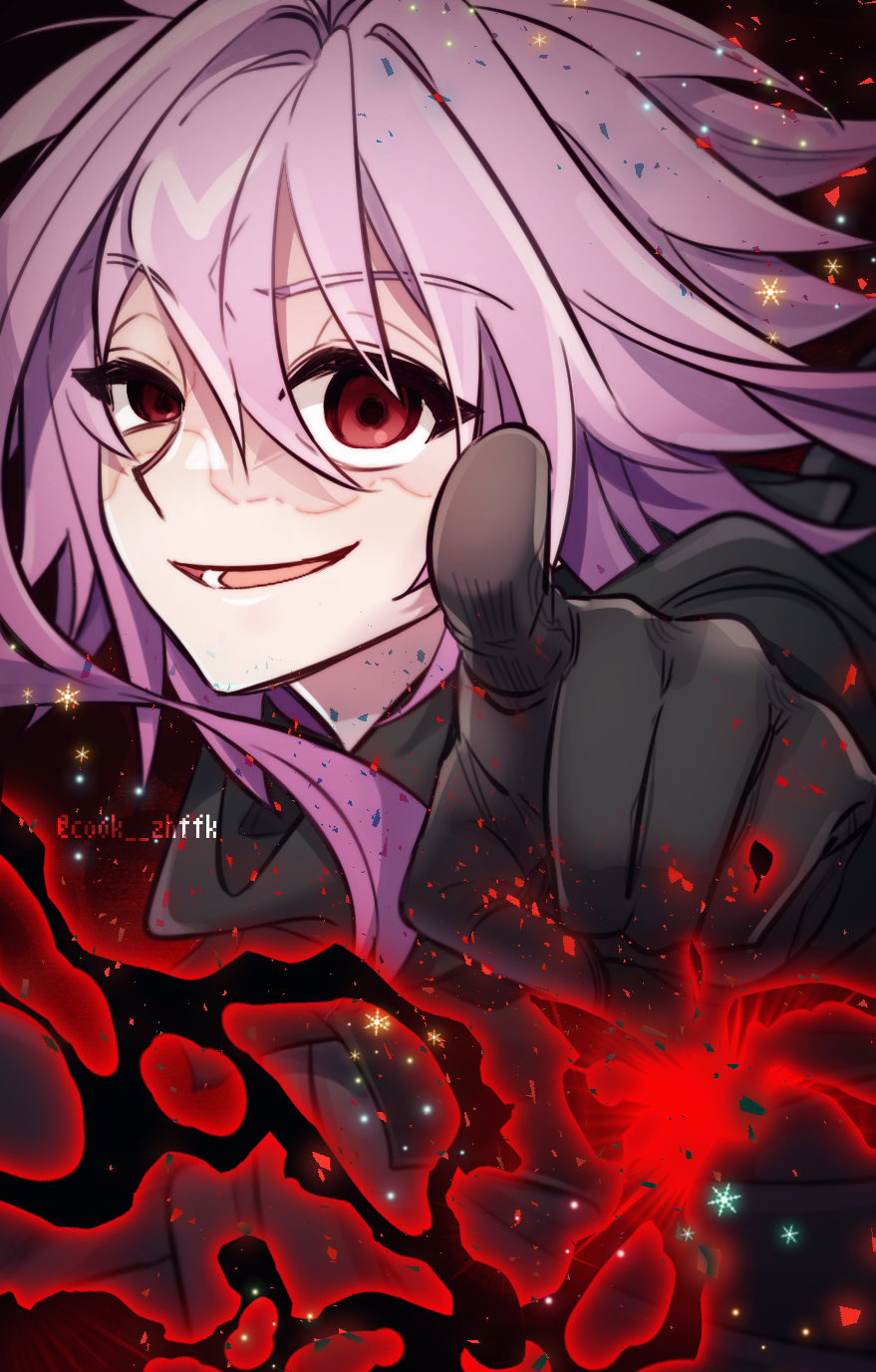 1boy black_gloves black_shirt gloves hair_between_eyes hair_intakes highres male_focus nijou_ryuu open_mouth patchwork_skin pink_hair pointing pointing_at_viewer red_eyes saibou_shinkyoku shirt short_hair_with_long_locks smile solo twitter_username uneven_eyes yummy_(pachi_u3u)