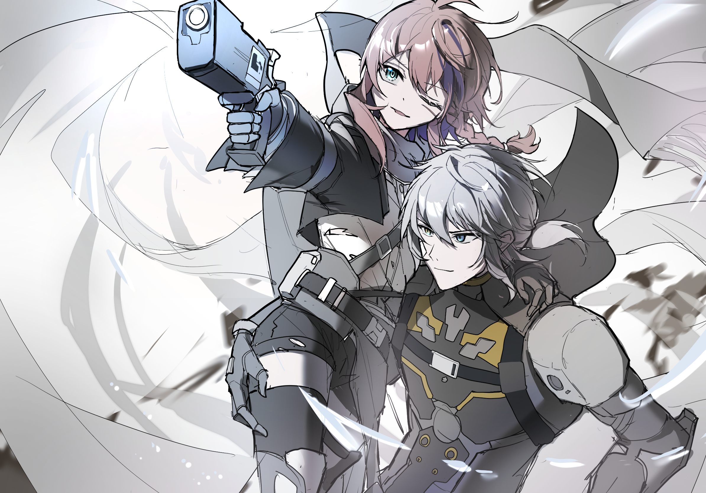 1boy 1girl bandaid bandaid_on_cheek bandaid_on_face black_jacket black_shorts black_thighhighs blue_eyes bodysuit boots braid braided_sidelock carrying carrying_person chest_harness chinese_commentary commandant_(pgr) commentary cropped_jacket dust_cloud facial_scar floating_scarf gauntlets gloves green_eyes grey_gloves grey_hair gun hair_between_eyes handgun harness heterochromia highres holding holding_gun holding_weapon jacket one_eye_closed open_clothes open_jacket open_mouth orange_hair punishing:_gray_raven qinling_qiufeng scar scar_on_cheek scar_on_face scarf shirt shorts shoulder_pads smile thigh_boots thighhighs watanabe:_astral_(pgr) watanabe_(pgr) weapon white_scarf white_shirt yellow_eyes