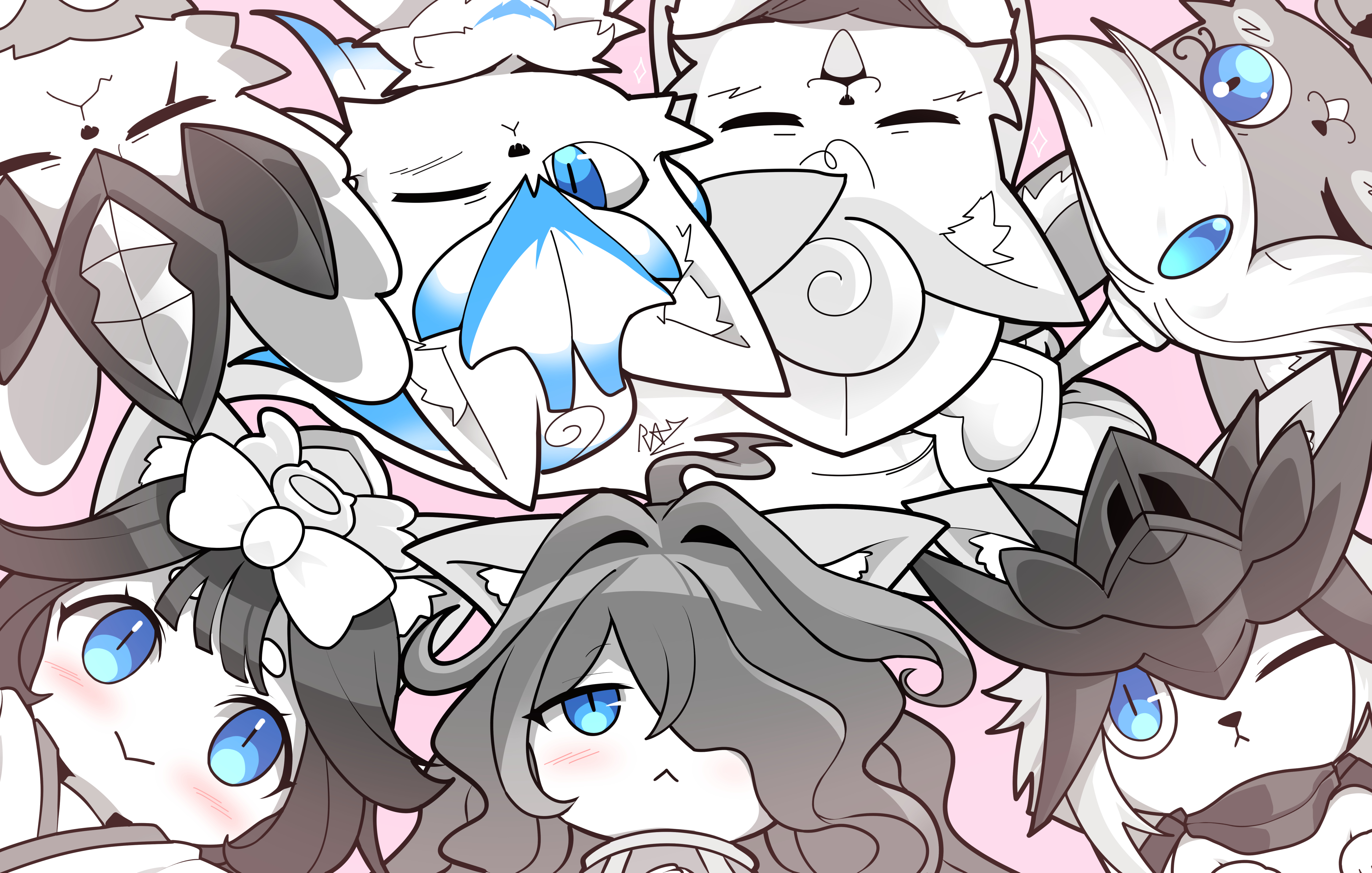 3girls 4boys absurdres ahoge animal_ears animal_nose black_hair blue_eyes blush bow bowtie cat cat_ears chibi chibi_only curly_hair d'artanyan_(nyanko_daisensou) dancer eyelashes frown gao_(nyanko_daisensou) gem hair_over_eyes happy highres japanese_clothes kasli_(nyanko_daisensou) kimono long_hair looking_at_viewer mitama_(nyanko_daisensou) multiple_boys multiple_girls nyanko_daisensou one_eye_closed pink_background rak_rak_yee scar short_hair signature smile thick_eyebrows white_bow white_bowtie white_kimono