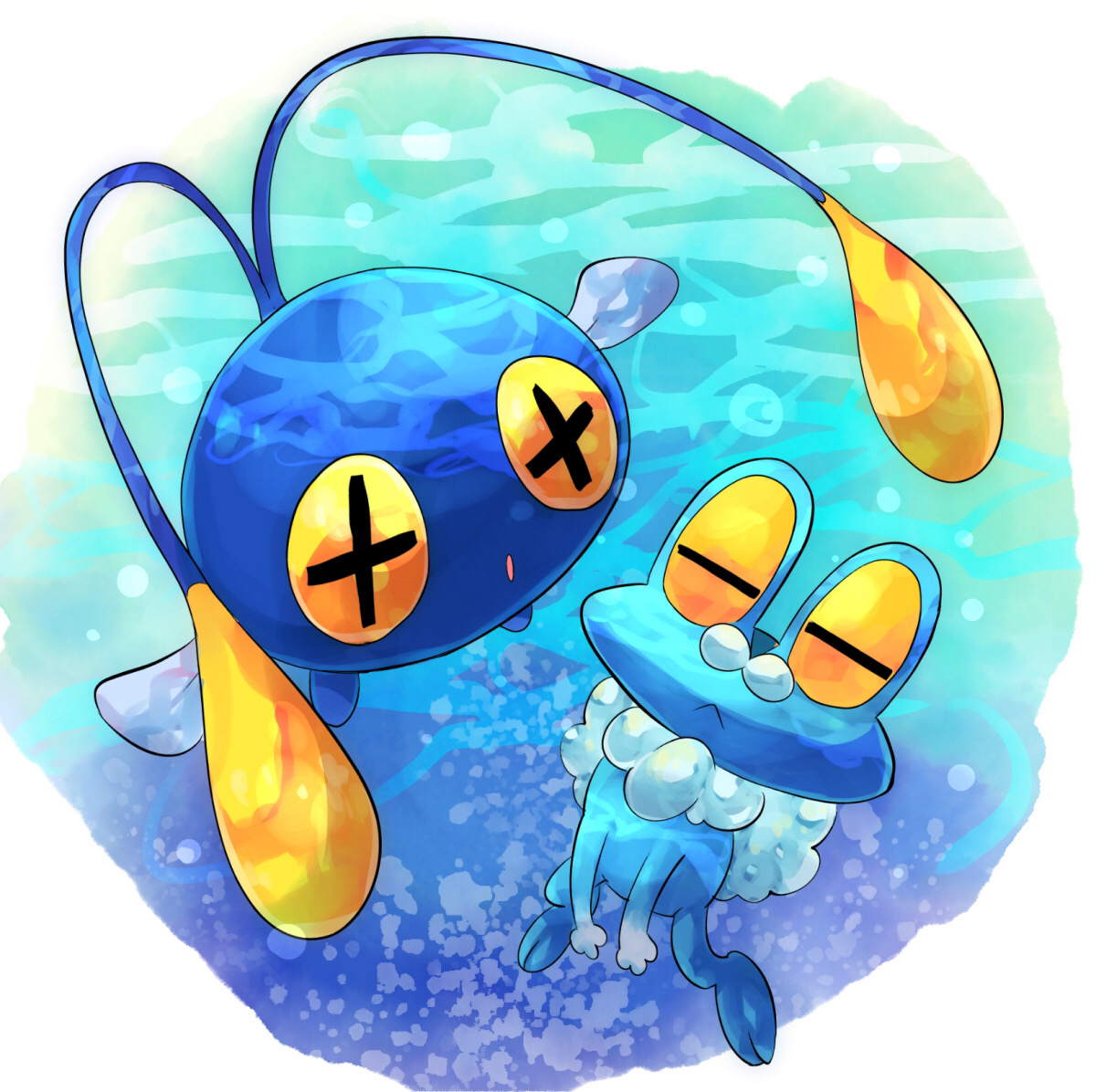 :o ajinomisni animal_focus antennae black_eyes chinchou closed_eyes closed_mouth colored_sclera froakie frown gen_2_pokemon gen_6_pokemon nintendo no_humans open_mouth pokemon pokemon_(creature) underwater water yellow_sclera