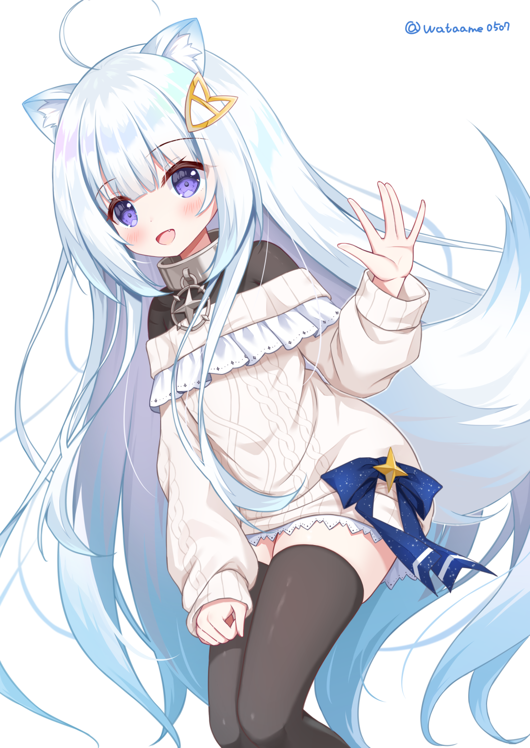 1girl :d \||/ ahoge animal_ears bent_over black_thighhighs blue_bow blue_hair blush bow cable_knit collar fox_ears fox_girl fox_tail hair_ornament highres long_hair looking_at_viewer metal_collar open_mouth original purple_eyes smile solo sweater tail thighhighs very_long_hair yukinotsuki zettai_ryouiki ||/