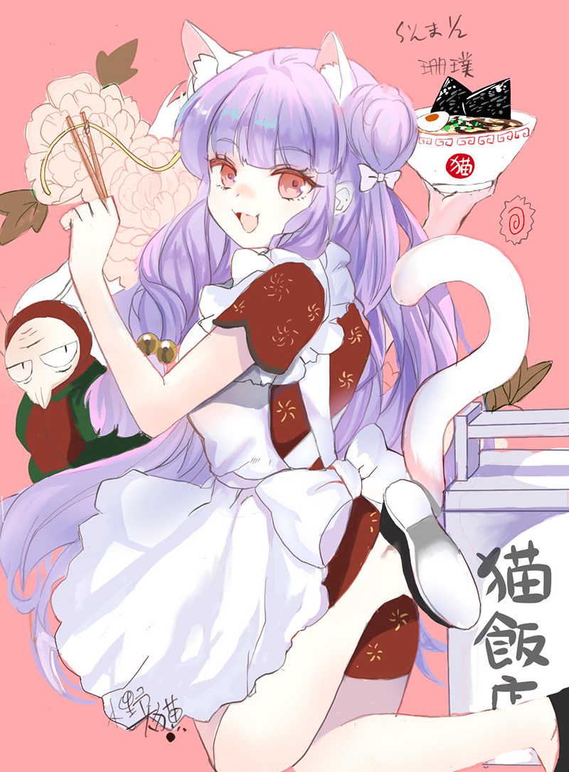 :d animal_ear_fluff animal_ears apron bell black_footwear bowl cat_ears cat_girl cat_tail character_request china_dress chinese_clothes chopsticks commentary_request double_bun dress food frilled_apron frills from_behind hair_bell hair_bun hair_ornament holding holding_bowl holding_chopsticks jingle_bell kemonomimi_mode long_hair looking_at_viewer looking_back lunacats noodles open_mouth pink_background purple_hair ranma_1/2 red_dress shampoo_(ranma_1/2) shoe_soles shoes short_sleeves simple_background smile tail very_long_hair white_apron