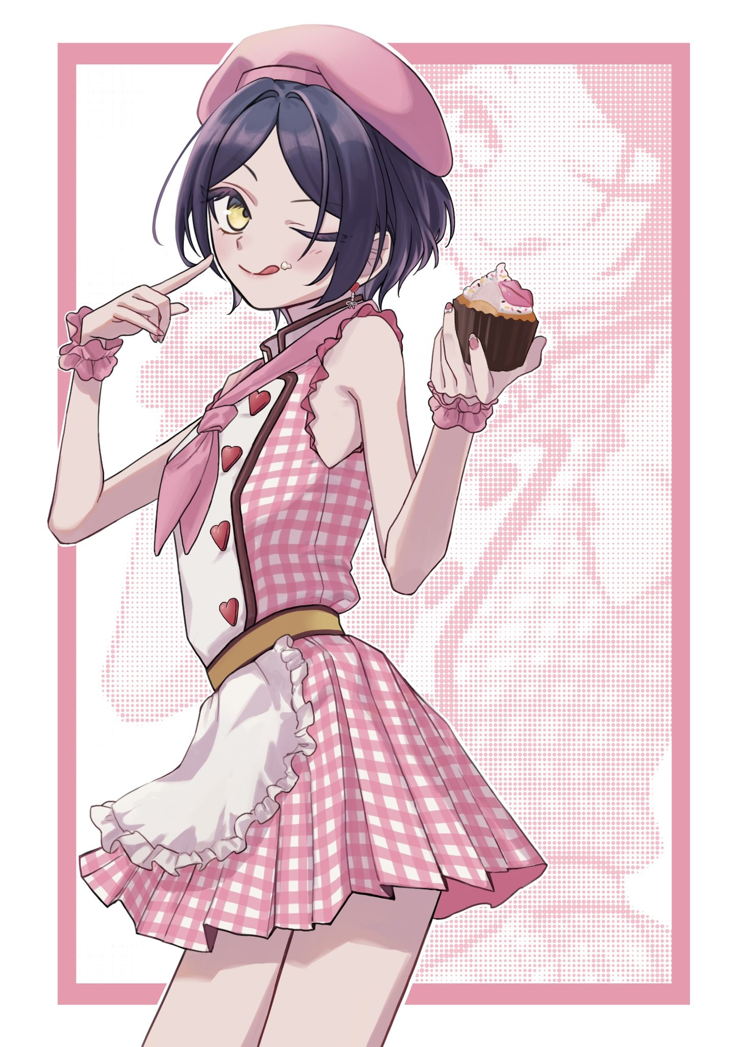 1girl :q apron beret black_hair blush cupcake dress food hat hayami_kanade highres idolmaster idolmaster_cinderella_girls looking_at_viewer one_eye_closed pink_dress short_hair smile solo tongue tongue_out usama yellow_eyes zoom_layer
