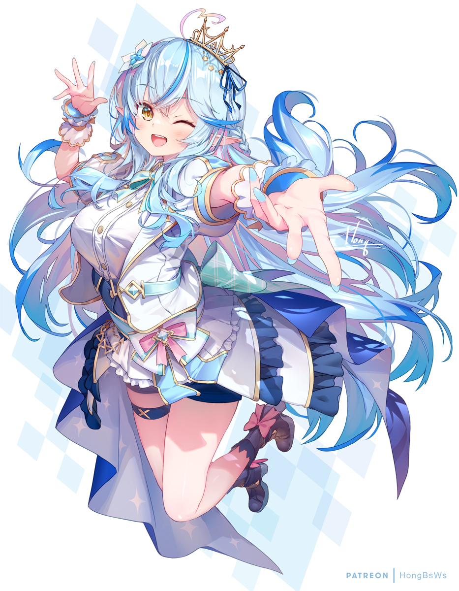1girl ;d blue_eyes blue_hair blue_nails blue_ribbon breasts commentary_request crown fingernails hair_ribbon hand_up highres hololive hololive_idol_uniform_(bright) hong_(white_spider) large_breasts long_hair looking_at_viewer multicolored_hair nail_polish one_eye_closed open_mouth patreon_username pointy_ears ribbon shirt smile thigh_strap thighs two-tone_hair virtual_youtuber white_background white_shirt yellow_eyes yukihana_lamy