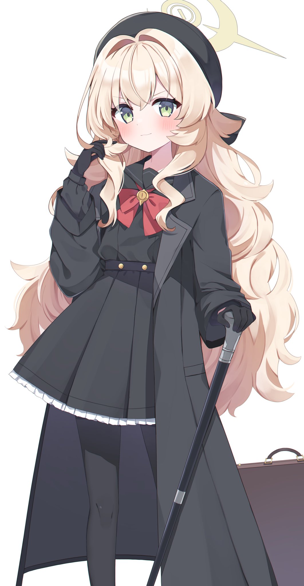 1girl beret black_gloves black_hat black_jacket black_pantyhose black_shirt black_skirt blonde_hair blue_archive bow bowtie cane closed_mouth gloves green_eyes halo hat highres holding holding_cane jacket long_hair looking_at_viewer murase48 pantyhose professor_niyaniya_(blue_archive) red_bow red_bowtie school_uniform shirt simple_background skirt solo white_background yellow_halo