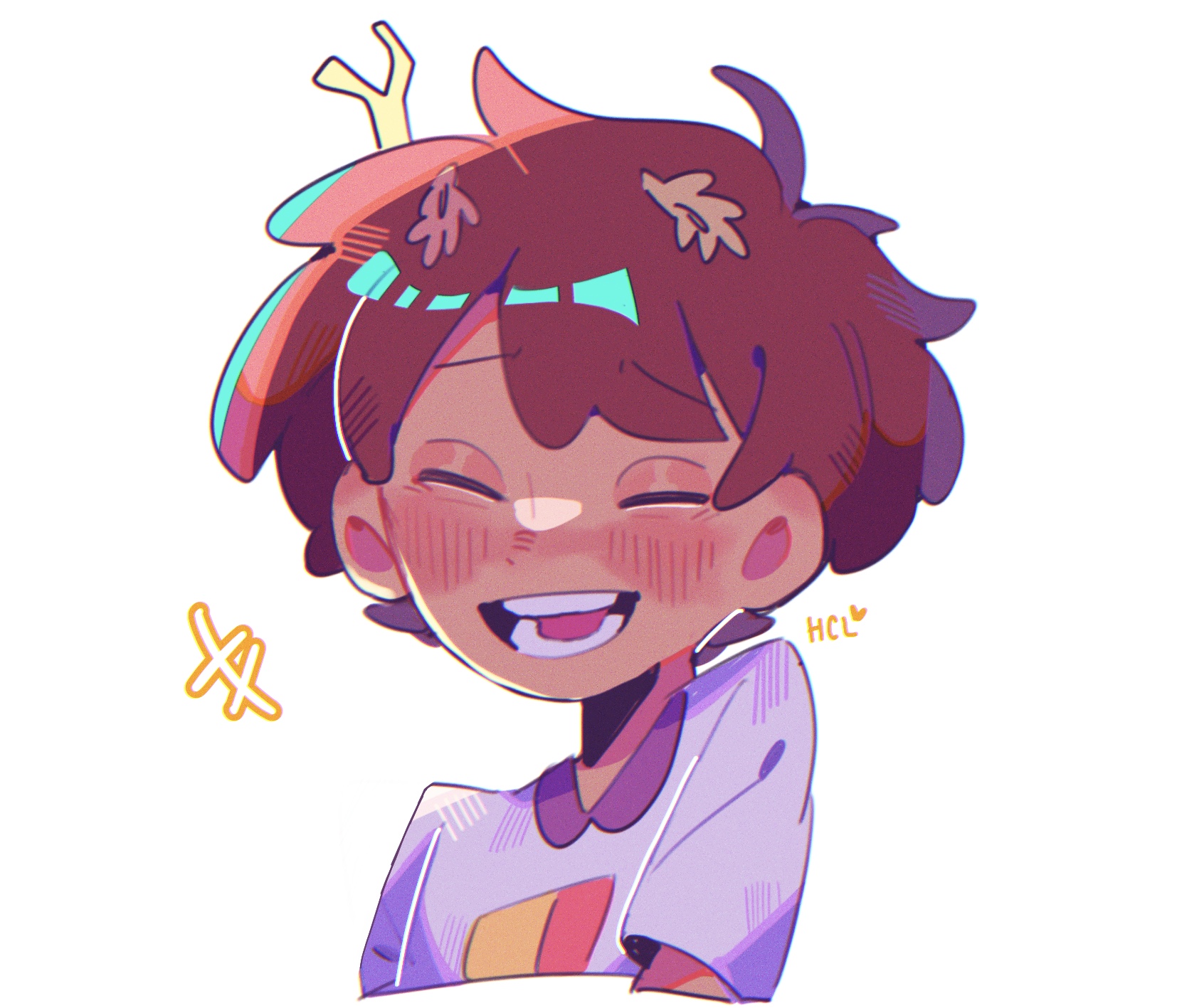 1girl amphibia anne_boonchuy artist_name blush brown_hair closed_eyes collared_shirt dark-skinned_female dark_skin grey_shirt highres laughing leaf leaf_on_head pinkukirby school_uniform shirt short_hair sjms_school_uniform smile teeth upper_body white_background