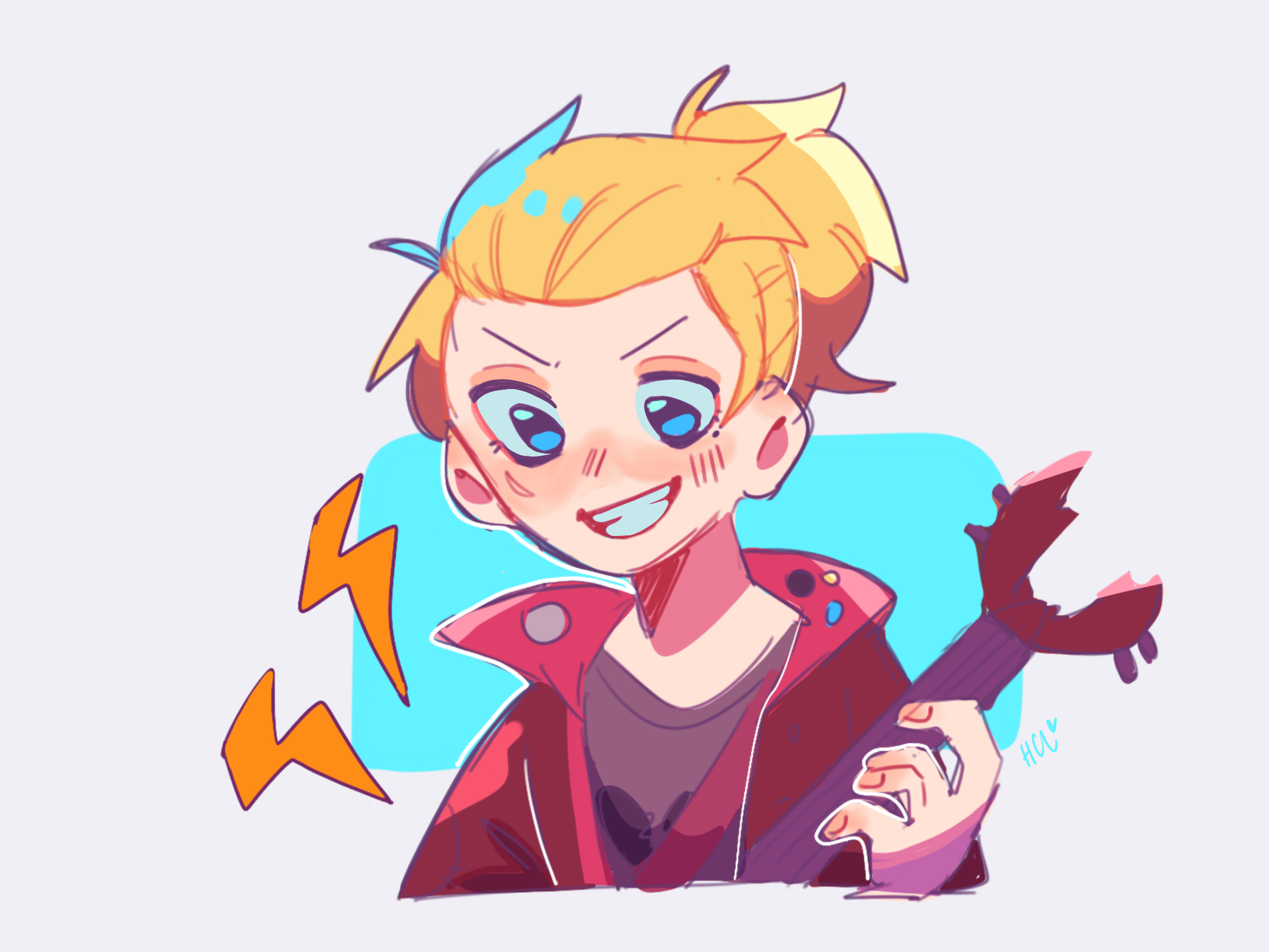 1girl amphibia artist_name black_shirt blonde_hair blue_eyes facial_scar grin guitar highres holding holding_guitar holding_instrument instrument jacket light_blush mole mole_under_eye pinkukirby ponytail red_jacket sasha_waybright scar scar_on_cheek scar_on_face shirt smile solo spiked_hair teeth upper_body