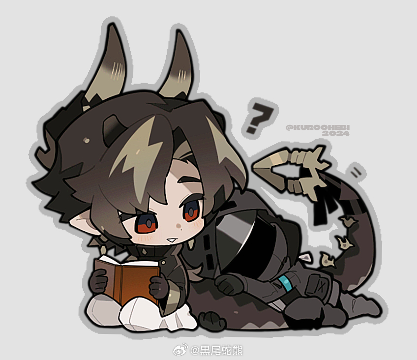 1boy 1other ambiguous_gender arknights black_coat brown_hair chibi chongyue_(arknights) coat commentary commentary_request doctor_(arknights) dragon_boy dragon_horns dragon_tail full_body grey_background heiwei_she_xiong horns hugging_another's_tail hugging_tail long_hair long_sleeves looking_at_another low_ponytail multicolored_hair pointy_ears ponytail red_eyes ribbon simple_background sitting streaked_hair untranslatable_commentary tail tail_ornament tail_ribbon