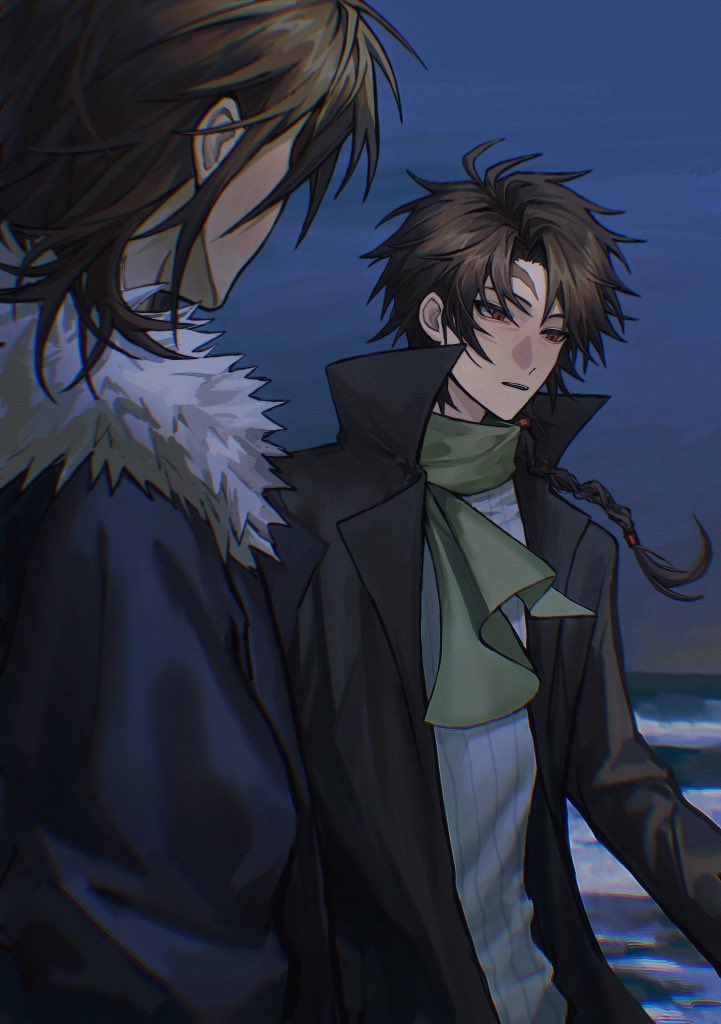 2boys black_jacket blue_jacket blue_sky bonley braid brown_hair chinese_commentary chromatic_aberration commentary_request fur-trimmed_jacket fur_trim green_scarf grey_sweater harada_minoru isoi_reiji jacket long_sleeves male_focus medium_hair multiple_boys ocean open_clothes open_jacket outdoors red_eyes ribbed_sweater saibou_shinkyoku scar scar_on_face scar_on_forehead scarf side_braid single_braid sky sweater upper_body