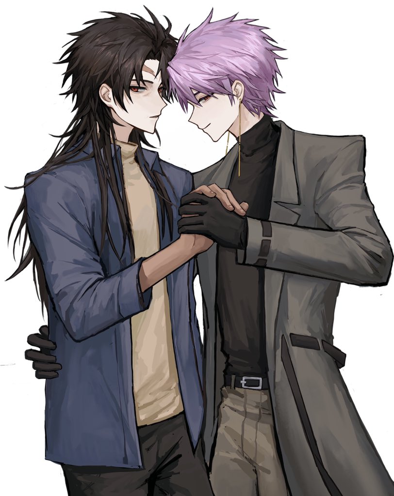 2boys belt black_belt black_gloves black_pants black_sweater blue_shirt bonley brown_hair brown_pants closed_mouth coat collared_shirt cowboy_shot earrings gloves grey_coat hand_on_another's_waist harada_minoru holding_hands jewelry long_hair long_sleeves male_focus multiple_boys open_belt open_clothes open_coat open_shirt pants parted_lips pink_hair red_eyes saibou_shinkyoku scar scar_on_face scar_on_forehead shirt short_hair simple_background smile sweater theodore_riddle turtleneck turtleneck_sweater white_background yellow_sweater
