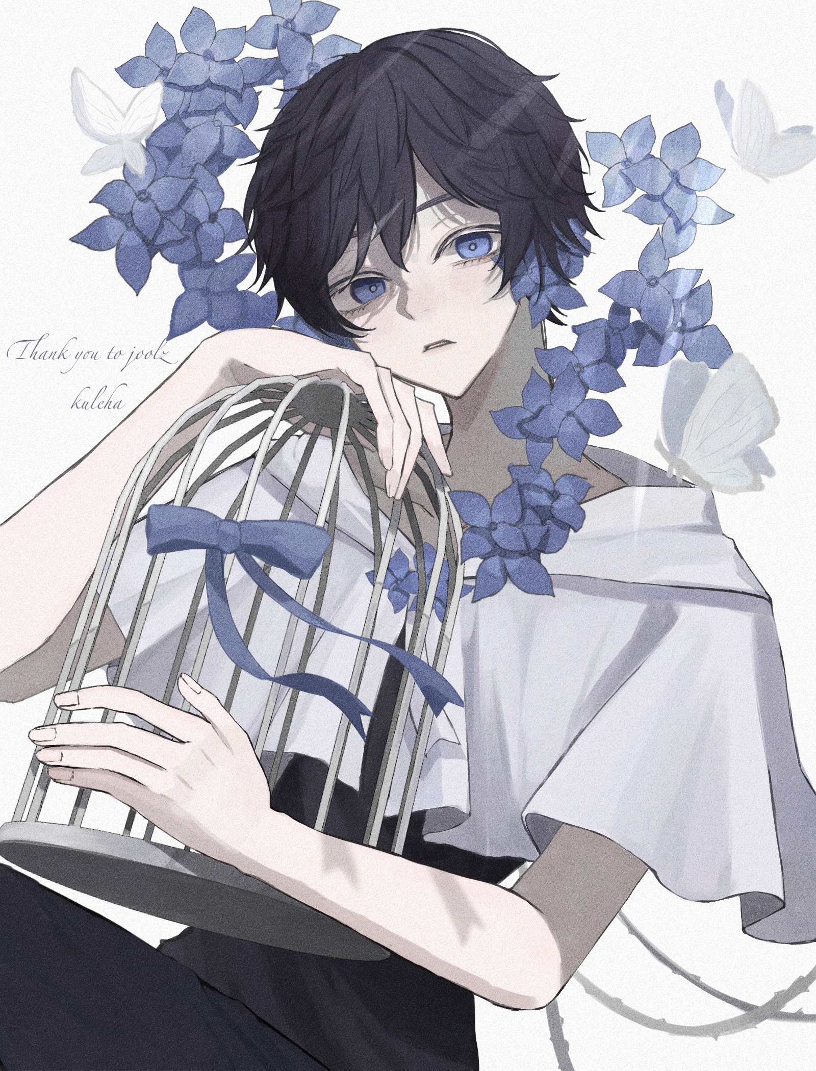 1boy artist_name birdcage black_hair black_pants black_shirt blue_eyes blue_flower blue_ribbon bug butterfly cage commentary_request commission english_text flower flower_request highres holding insect kuleha_s looking_at_viewer male_focus original pants parted_lips ribbon shirt short_hair simple_background sitting skeb_commission solo white_background