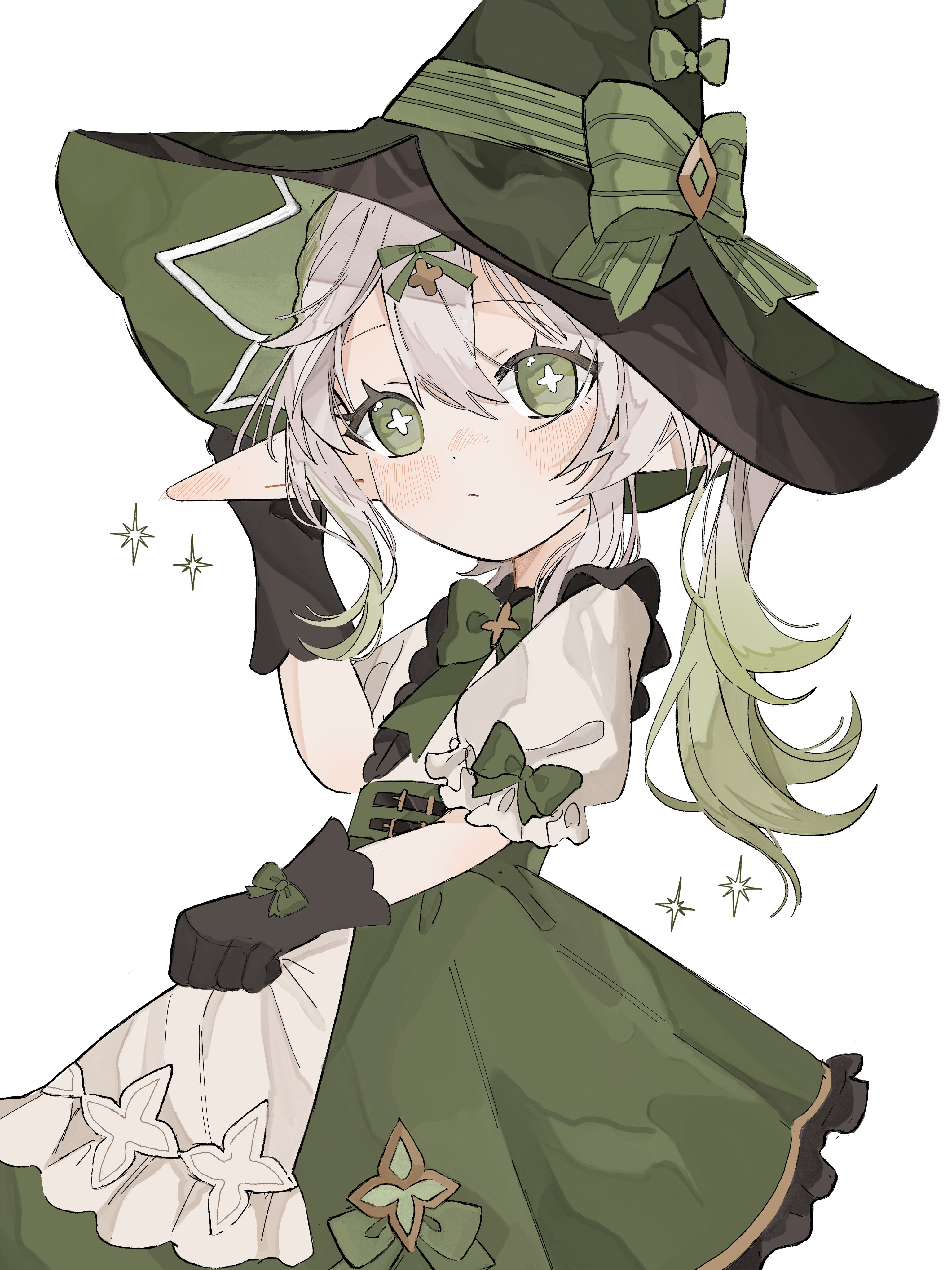 1girl absurdres adjusting_clothes adjusting_headwear alternate_color apron arm_up black_gloves blush bow commentary_request cosplay from_side genshin_impact gloves gradient_hair green_bow green_eyes green_hair green_hat green_ribbon green_skirt hair_between_eyes hair_bow hat hat_bow hat_ribbon highres holding_own_skirt klee_(blossoming_starlight)_(genshin_impact) klee_(genshin_impact) klee_(genshin_impact)_(cosplay) kumane_(osakanadonn) looking_at_viewer looking_to_the_side multicolored_hair nahida_(genshin_impact) pointy_ears ribbon shirt side_ponytail simple_background skirt solo symbol-shaped_pupils waist_apron white_apron white_background white_hair white_shirt witch_hat