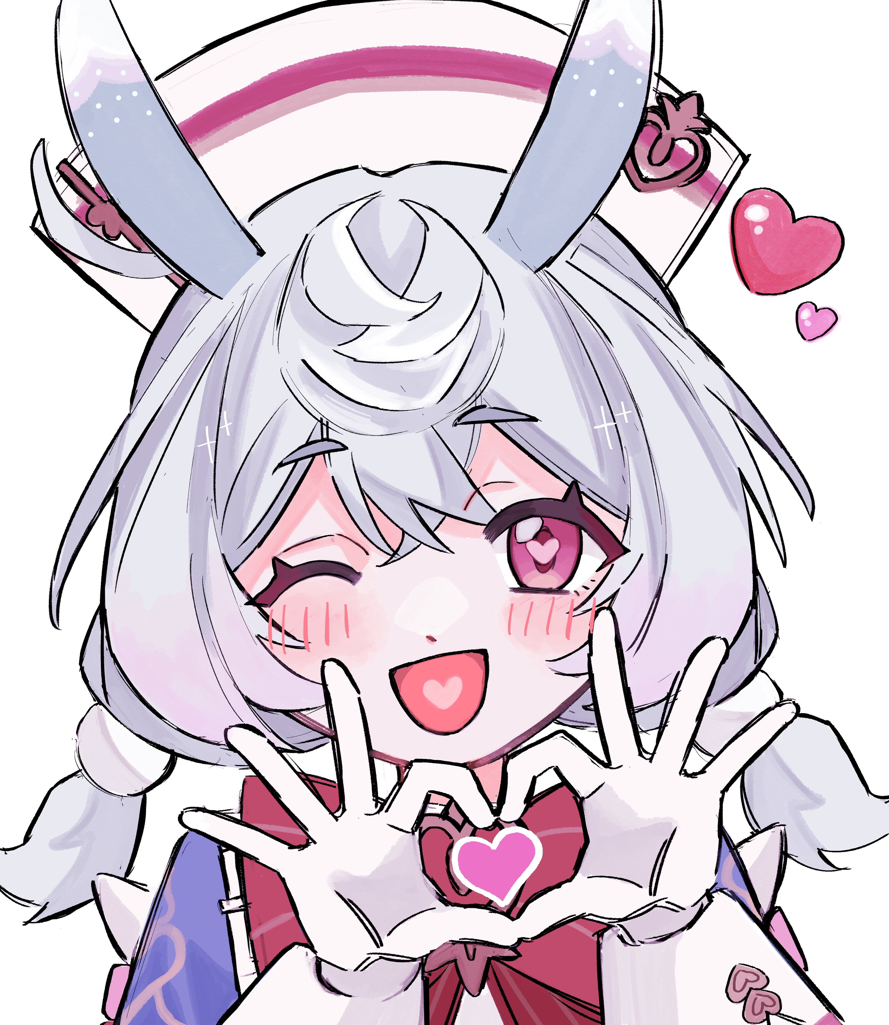 1girl ;d absurdres animal_ears blue_hair blue_sweater bow bowtie brooch colored_tips cowlick crossed_bangs dot_nose genshin_impact gloves gold_trim hair_between_eyes hair_ornament hat heart heart-shaped_pupils heart_brooch heart_hands highres jewelry kumane_(osakanadonn) light_blue_hair light_blush long_hair low_twintails multicolored_hair nurse_cap one_eye_closed open_mouth pink_eyes pom_pom_(clothes) pom_pom_hair_ornament rabbit_ears raised_eyebrows red_bow red_bowtie short_twintails sidelocks sigewinne_(genshin_impact) simple_background smile sweater symbol-shaped_pupils twintails upper_body white_background white_gloves white_hat