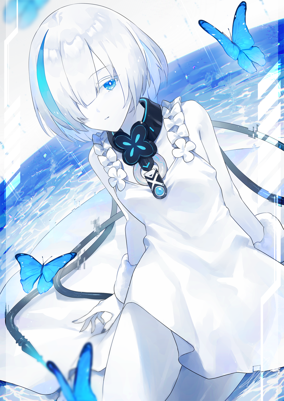 1girl arms_behind_back azur_lane bare_shoulders black_nails blue_butterfly blue_eyes blue_hair bug butterfly closed_mouth colored_skin commentary_request dress expressionless glowing_butterfly hair_over_one_eye highres insect kazu_satou looking_at_viewer medium_hair multicolored_hair nail_polish pale_skin sleeveless sleeveless_dress solo streaked_hair tb_(azur_lane) two-tone_hair white_dress white_hair white_skin