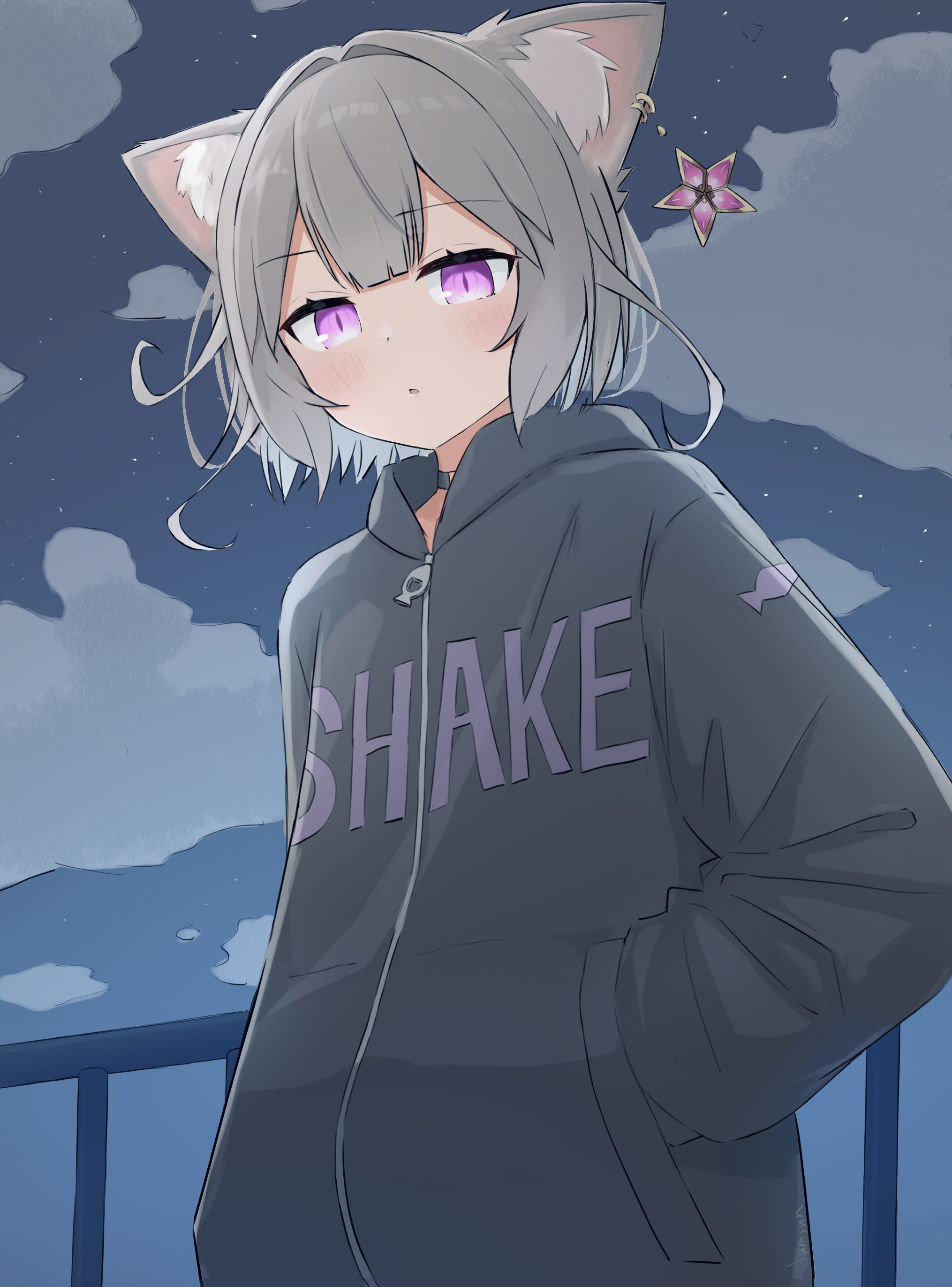 1girl absurdres animal_ear_fluff animal_ears black_jacket cat_ears cat_girl cloud cloudy_sky grey_hair hand_in_pocket highres jacket long_sleeves looking_at_viewer neo-porte night purple_eyes samusun short_hair sky star_(sky) starry_sky virtual_youtuber yozuna_niu