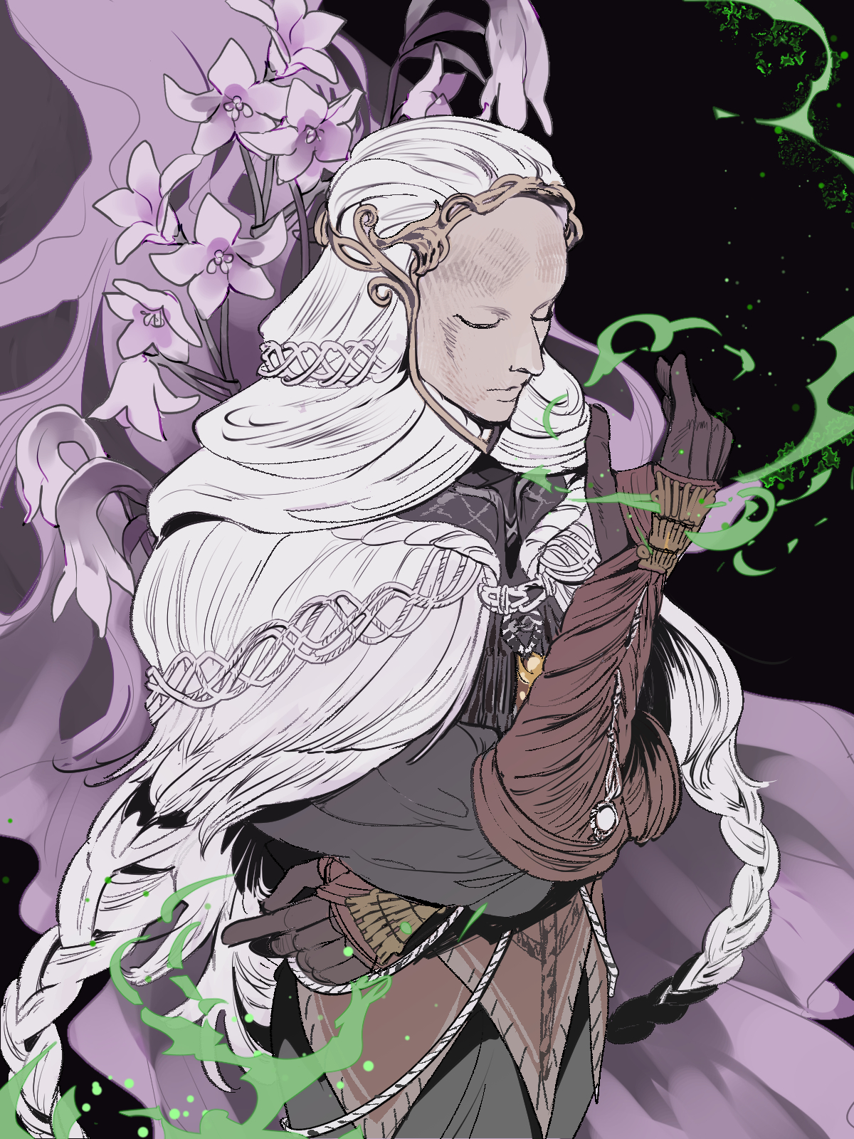 1boy black_background black_gloves black_pants black_shirt braid capelet cowboy_shot elbow_gloves elden_ring elden_ring:_shadow_of_the_erdtree flower gloves hand_up highres hood hood_up kero_1110 long_hair male_focus mask pants purple_flower shirt solo standing thiollier_(elden_ring) white_capelet white_hood