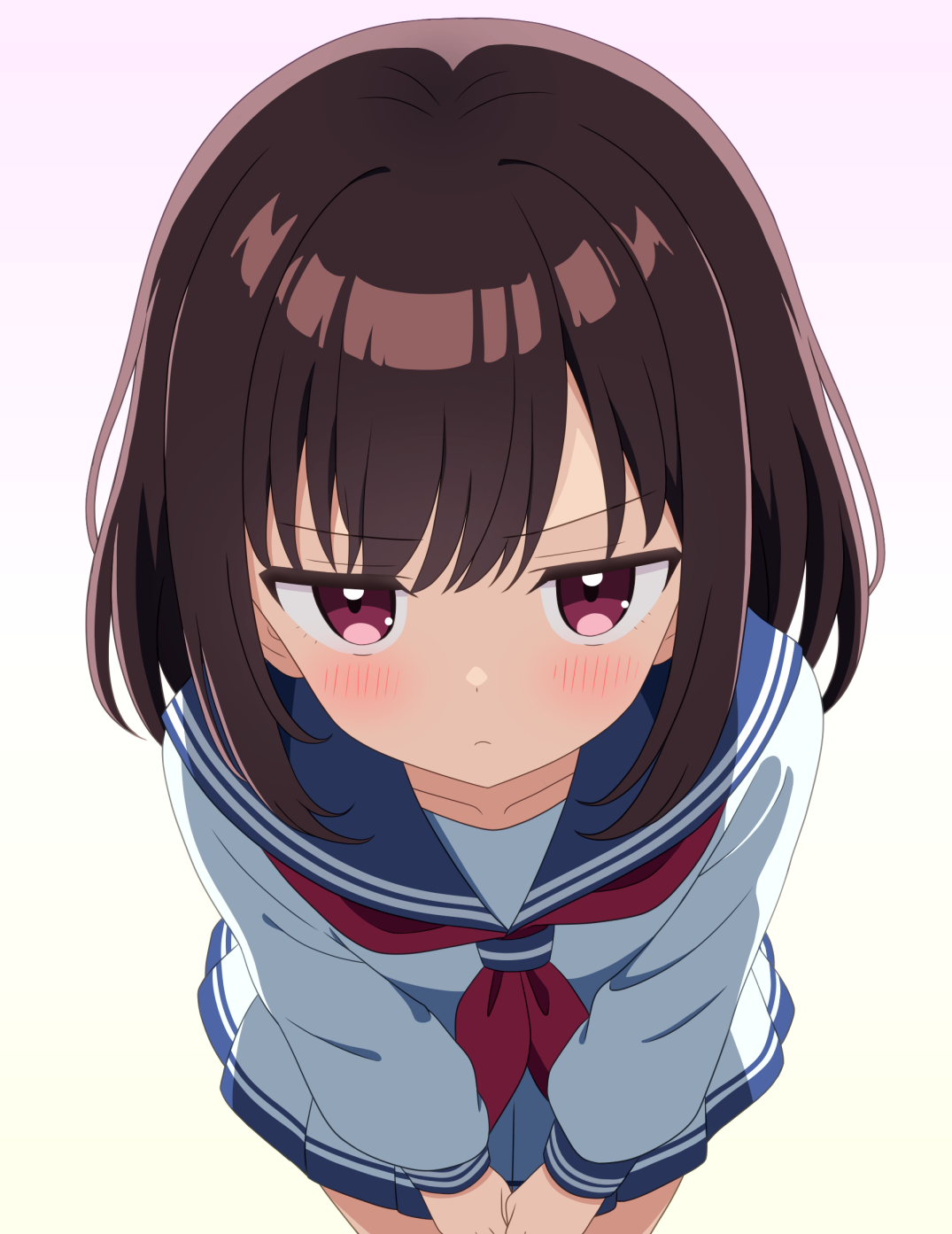 1girl blue_sailor_collar blush brown_hair child commentary from_above highres light_frown long_sleeves medium_hair neckerchief original pink_eyes red_neckerchief sailor_collar school_uniform serafuku shirt sidelocks simple_background solo take_zenni_chikuzenni v-shaped_eyebrows v_arms white_background white_serafuku white_shirt