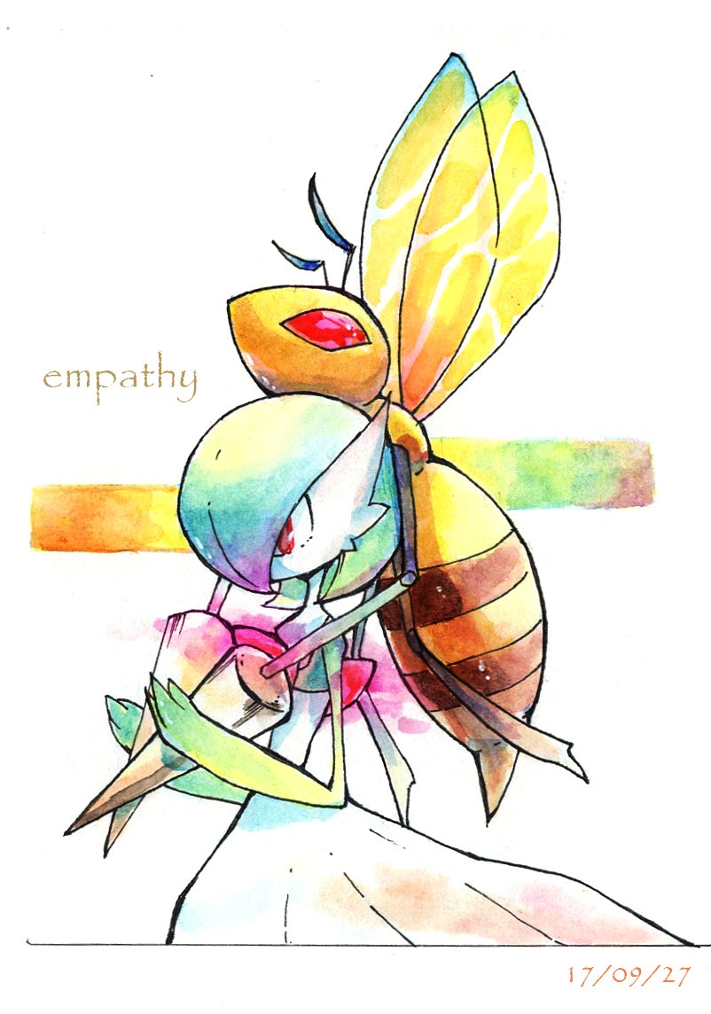 antennae bee beedrill bug colored_skin dated dress from_side gardevoir gen_1_pokemon gen_3_pokemon green_hair green_skin insect insect_wings koutetu_sin multicolored_skin nintendo pokemon pokemon_(creature) simple_background stinger two-tone_skin white_background white_dress white_skin wings