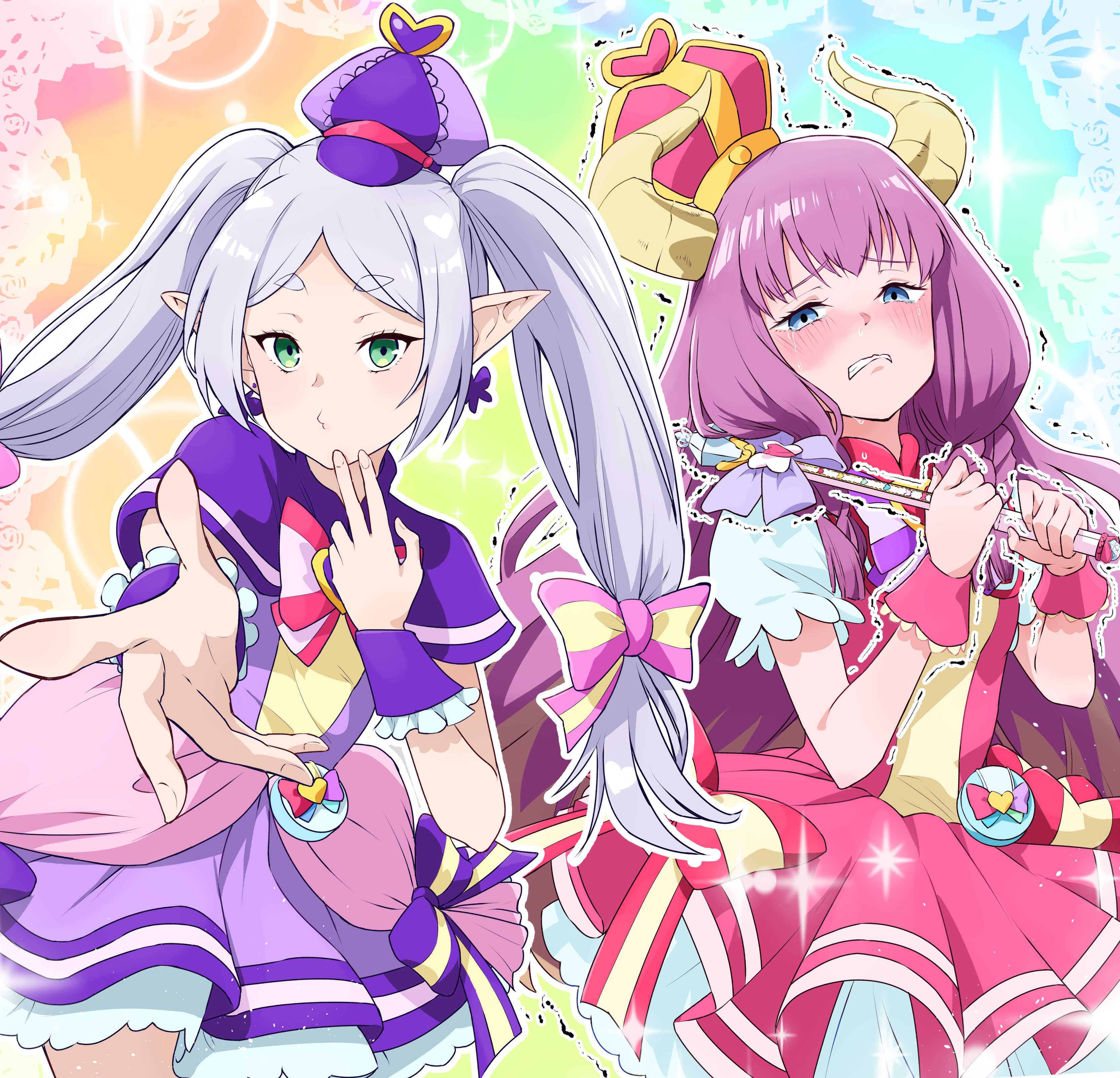 2girls absurdres alternate_costume arched_crown aura_(sousou_no_frieren) aura_bullying_(meme) blowing_kiss blue_eyes blush bow bowtie brooch cape commentary_request cosplay cowboy_shot crown cure_friendy cure_friendy_(cosplay) cure_wonderful cure_wonderful_(cosplay) demon_girl demon_horns dress dress_bow elf friendly_tact frieren frown gradient_background green_eyes grimace hair_bow hair_over_shoulder half-closed_eyes hand_up hands_up heart heart_brooch highres holding holding_wand horns inukai_iroha inukai_komugi jewelry keijirou_(mukunozaltusou) long_hair magical_girl meme multiple_girls o3o outstretched_arm parted_bangs peach_rod petticoat pink_bow pink_crown pink_dress pink_wrist_cuffs pointy_ears pouch precure puffy_short_sleeves puffy_sleeves purple_bow purple_bowtie purple_cape purple_dress purple_hair purple_wrist_cuffs quad_braids rainbow_background red_bow red_bowtie red_dress short_dress short_sleeves sousou_no_frieren standing tanezaki_atsumi tearing_up trembling twintails upper_body voice_actor_connection wand white_hair wonderful_precure! wrist_cuffs yellow_bow