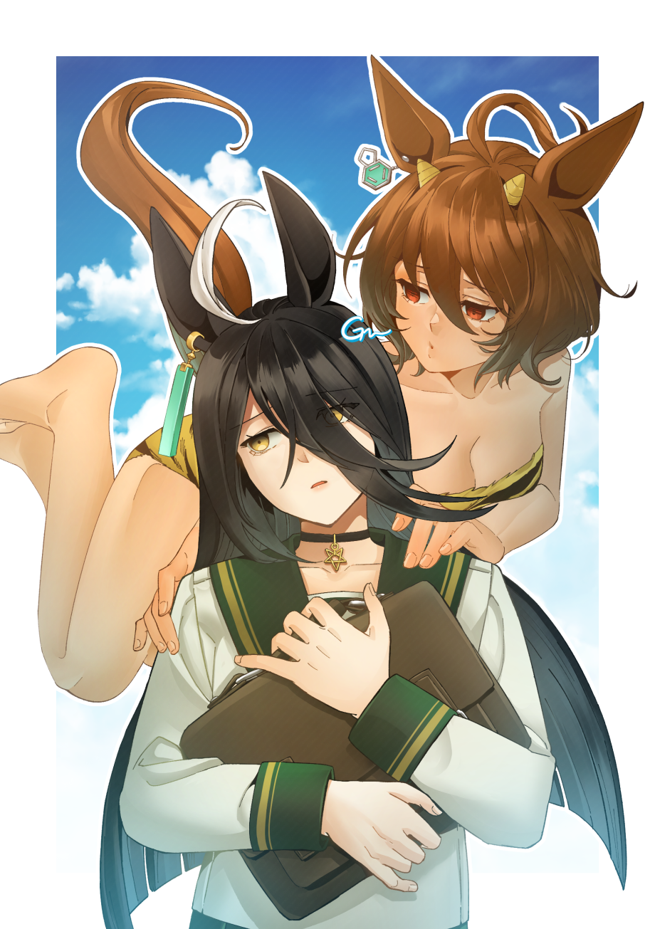 2girls agnes_tachyon_(umamusume) ahoge animal_ears animal_print bag bandeau bare_shoulders barefoot bikini black_hair breasts briefcase brown_hair choker cleavage cloud cosplay day earrings fake_horns floating gaman hair_between_eyes highres holding holding_bag horns horse_ears horse_girl horse_tail hugging_object jewelry long_hair long_sleeves looking_to_the_side lum lum_(cosplay) manhattan_cafe_(umamusume) multiple_girls puckered_lips red_eyes sailor_collar school_briefcase shirt short_hair sign single_earring small_breasts standing swimsuit tail tiger_print uesaka_sumire umamusume urusei_yatsura voice_actor_connection white_shirt yellow_eyes