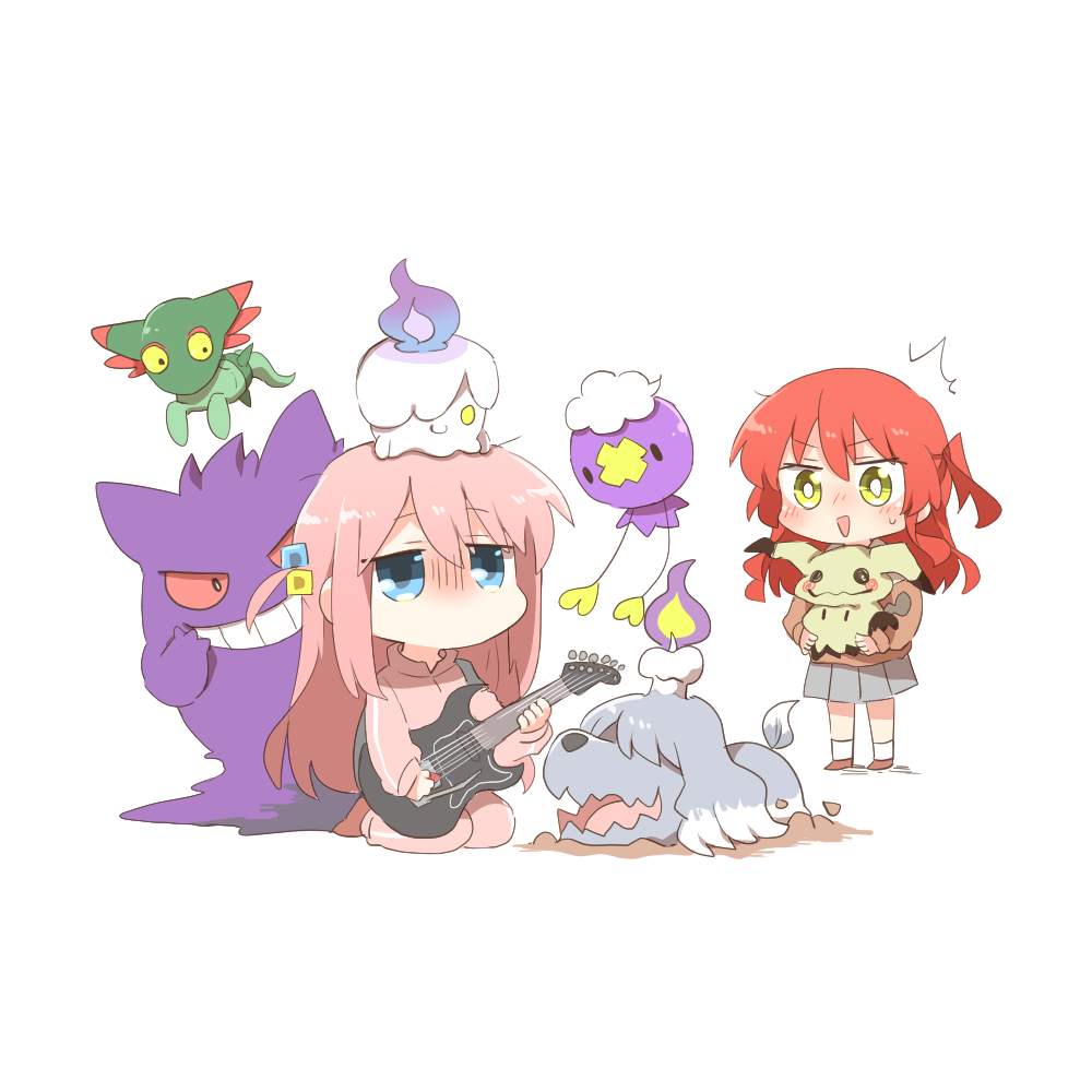 2girls blue_eyes blue_fire bocchi_the_rock! brown_footwear brown_shirt chibi crossover cube_hair_ornament dreepy drifloon electric_guitar fire gen_1_pokemon gen_4_pokemon gen_5_pokemon gen_7_pokemon gen_8_pokemon gengar gotoh_hitori greavard grey_skirt grin guitar hair_between_eyes hair_ornament holding holding_instrument instrument jacket kita_ikuyo litwick long_hair long_sleeves mimikyu multiple_girls nintendo one_side_up pants pink_hair pink_jacket pink_pants pleated_skirt plectrum pokemon pokemon_(creature) pokemon_team puffy_long_sleeves puffy_sleeves purple_fire rebecca_(keinelove) red_eyes red_hair seiza shirt shoes simple_background sitting skirt smile socks standing track_jacket track_pants track_suit turn_pale v-shaped_eyes very_long_hair white_background white_socks yellow_eyes