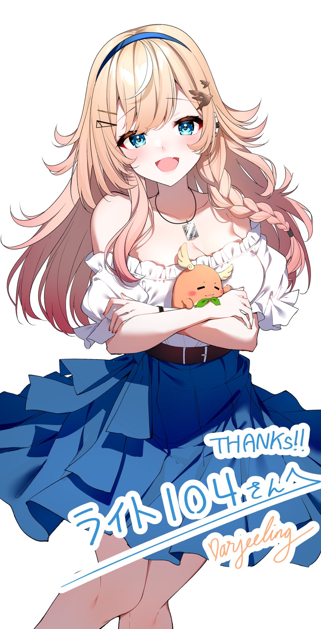 1girl :d belt blonde_hair blue_eyes blue_hairband blue_skirt blush braid collarbone commission commissioner_name crossed_arms darjeeling_(reley) frilled_shirt frills hair_ornament hairband hairclip highres indie_virtual_youtuber long_hair looking_at_viewer off-shoulder_shirt off_shoulder open_mouth second-party_source shirt signature simple_background skeb_commission skirt smile solo thank_you natsuki_tsubame virtual_youtuber watch white_background white_shirt wristwatch