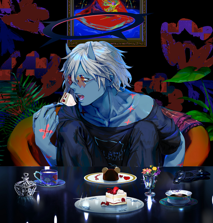 1boy black_gloves black_halo black_pants black_shirt blue_skin cake cake_slice chair chest_tattoo coffee colored_skin commentary cup drink eating english_commentary flower food fork glasses gloves guilty_gear guilty_gear_strive hair_behind_ear hair_between_eyes halo hand_tattoo hand_up happy_chaos holding holding_fork horns knees knees_up looking_to_the_side male_focus on_chair open_mouth orange-tinted_eyewear painting_(object) pants picture_frame plant potted_plant saucer shirt sitting solo sparkle star_(symbol) sugar_bowl t-shirt table tattoo tinted_eyewear tongue unworn_clothes unworn_gloves white_hair x-shaped_eyewear yellow_eyes yszlr
