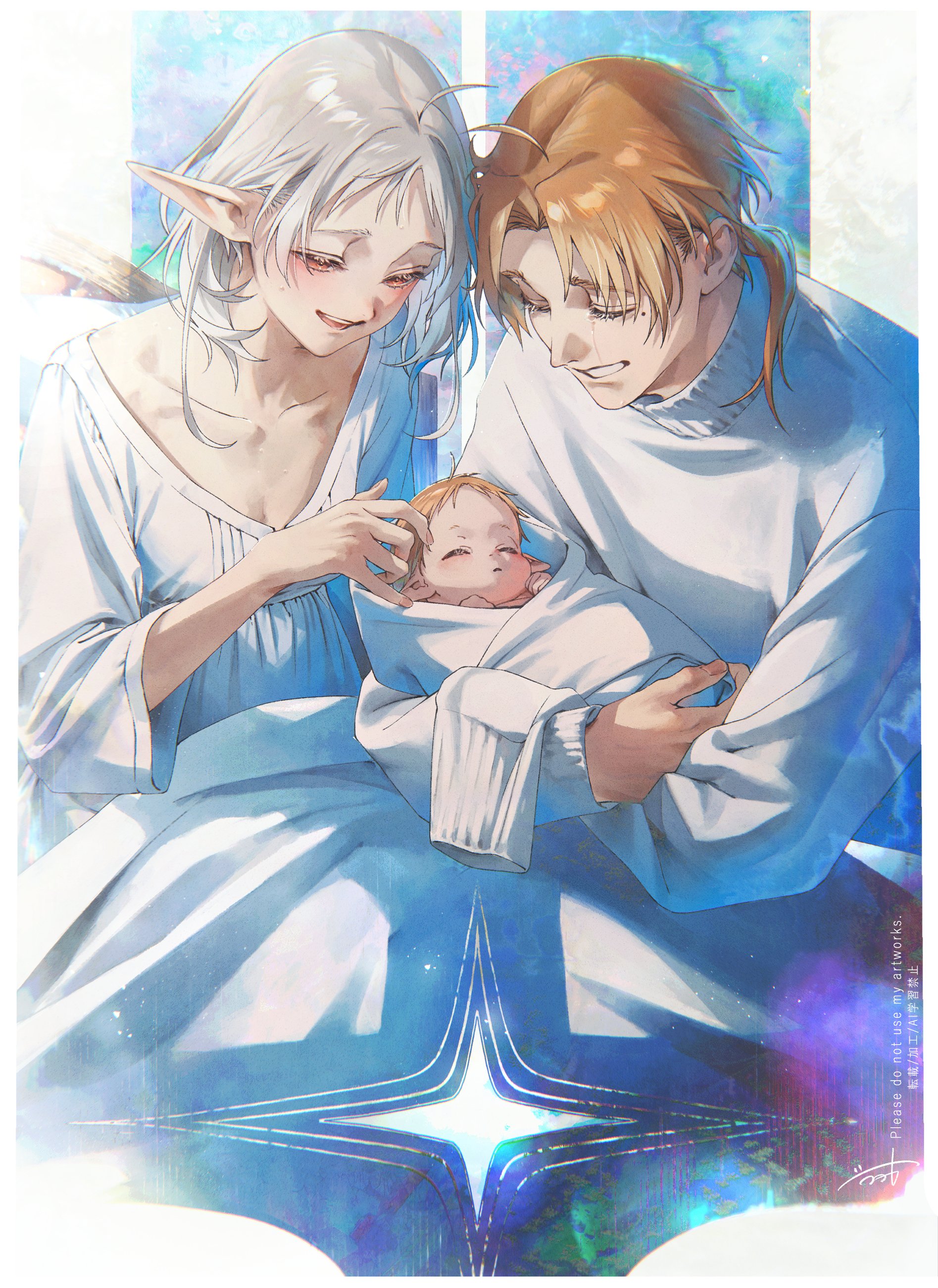 1boy 2girls absurdres ahoge baby blanket breasts brown_hair clenched_teeth closed_eyes crying father_and_child father_and_daughter highres husband_and_wife lucy_greyrat medium_hair mole mole_under_eye mother_and_child mother_and_daughter multiple_girls mushoku_tensei open_mouth parent_and_child pillow pointy_ears red_eyes rudeus_greyrat shirotaka_(5choume) shirt small_breasts sweater sylphiette_(mushoku_tensei) teeth turtleneck turtleneck_sweater white_hair white_shirt white_sweater