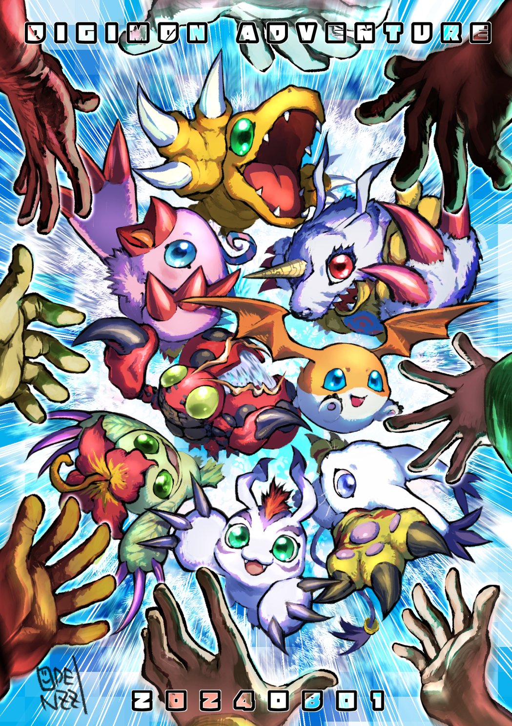 agumon animal_hands artist_logo artist_name bird blue_eyes blue_fur body_fur bug cat coat colored_skin copyright_name dated digimon digimon_(creature) digimon_adventure digimon_day feathers fur_coat gabumon gloves gomamon green_eyes hand_focus head_wings highres ishida_yamato izumi_koshiro kido_jo logo oden_(odenzzi) open_mouth orange_skin palmon patamon paw_gloves pink_feathers piyomon red_eyes reptile sharp_teeth tachikawa_mimi tailmon takaishi_takeru takenouchi_sora teeth tentomon white_fur wings yagami_hikari yagami_taichi