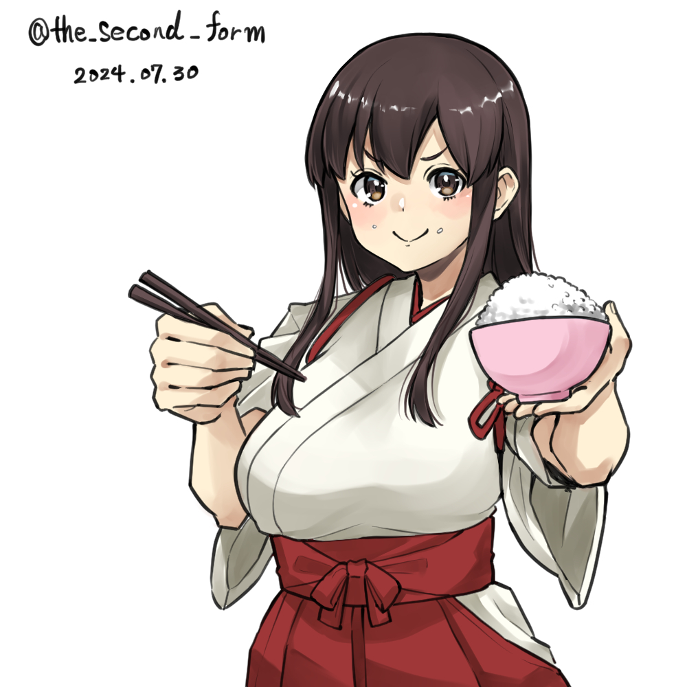 1girl akagi_(kancolle) black_hair bowl breasts brown_eyes chopsticks hakama hakama_skirt holly_dainikeitai japanese_clothes kantai_collection large_breasts long_hair one-hour_drawing_challenge red_hakama rice sidelocks simple_background skirt solo tasuki upper_body white_background