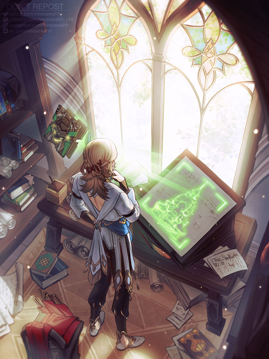 1boy artist_name back_cutout black_gloves black_pants blonde_hair blue_sash blueprint_(object) book book_stack braid cape chair clothing_cutout day facing_away feather_hair_ornament feathers fingerless_gloves from_above from_behind genshin_impact gloves gold_trim hair_ornament hairclip hand_up hashtag-only_commentary highres indoors instagram_logo instagram_username kaveh_(genshin_impact) light_particles light_rays long_hair long_sleeves male_focus mehrak_(genshin_impact) neesawahh pants paper patreon_logo patreon_username puffy_long_sleeves puffy_sleeves red_cape rug sash scroll shadow shirt shoes single_braid solo stained_glass standing suitcase table tile_floor tiles twitter_logo twitter_username unworn_cape vkontakte_logo vk_username watermark web_address white_shirt white_shoes window wooden_chair wooden_table x_hair_ornament