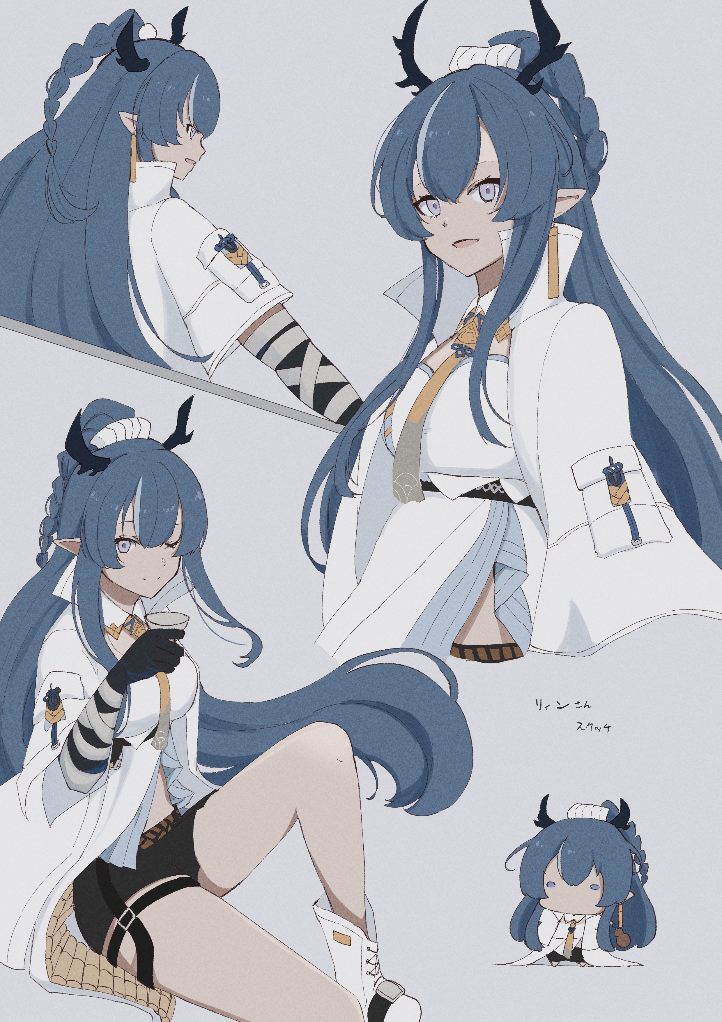 1girl absurdres arknights black_shorts blue_eyes blue_hair blue_horns braid closed_mouth coat commentary_request dragon_girl dragon_horns earrings gloves grey_background hair_between_eyes highres holding horns jacket jewelry ling_(arknights) long_hair long_sleeves looking_at_viewer multiple_views necktie one_eye_closed open_clothes open_coat pointy_ears shirt shorts sima_(164s25) simple_background sitting smile very_long_hair white_jacket white_shirt yellow_necktie