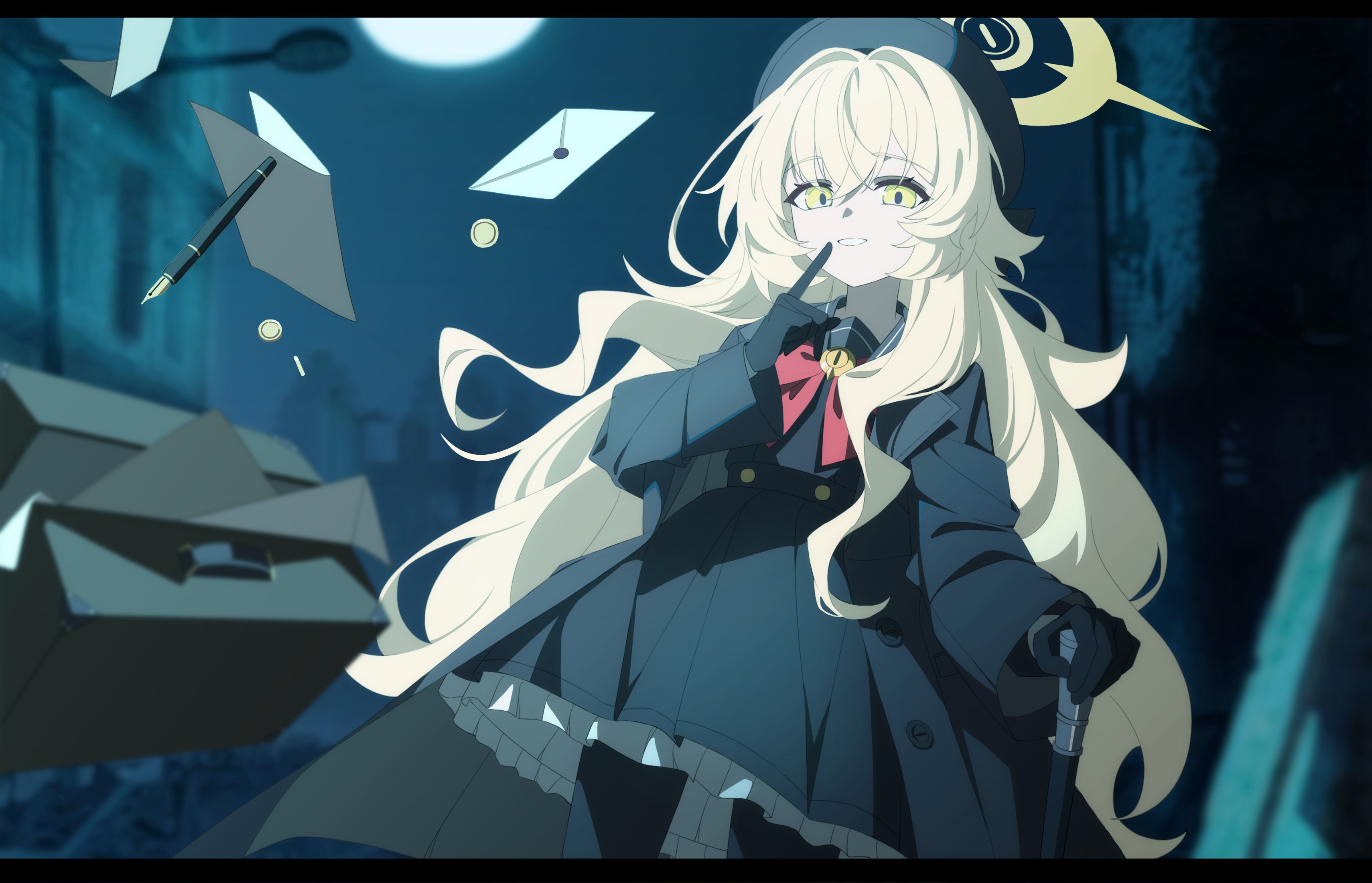 1girl absurdres beret black_coat black_gloves black_hat black_pantyhose black_sailor_collar black_serafuku black_shirt black_skirt blonde_hair blue_archive blurry blurry_background bow bowtie box cane coat coin commentary_request dusk_ming envelope finger_to_mouth frilled_skirt frills gloves hair_between_eyes halo hat highres holding holding_cane letterboxed long_hair long_sleeves looking_at_viewer night open_clothes open_coat outdoors pantyhose pen professor_niyaniya_(blue_archive) red_bow red_bowtie sailor_collar school_uniform serafuku shirt skirt smile solo teeth very_long_hair yellow_eyes yellow_halo
