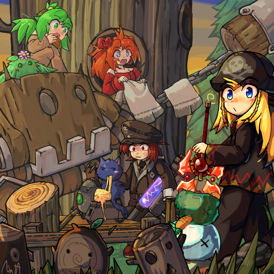 2boys 2girls anger_vein anna_(epic_battle_fantasy) belt black_jacket black_necktie black_pants blonde_hair blue_eyes blush_stickers braid brown_dress carrot cat chain cheese detached_sleeves dress eating epic_battle_fantasy flower food grass green_bush_(epic_battle_fantasy) green_eyes green_hair gun hair_ribbon hanging_on_clothesline hat holding holding_gun holding_sword holding_weapon inferno_(epic_battle_fantasy) instrument jacket lance_(epic_battle_fantasy) long_hair matt_(epic_battle_fantasy) medium_hair mighty_oak_(epic_battle_fantasy) multiple_boys multiple_girls mushroom nat-a-fugue natalie_(epic_battle_fantasy) necktie nolegs_(epic_battle_fantasy) ocarina orange_hair pants peaked_cap pine_tree pink_flower pirate_hat plant positron_rifle_(epic_battle_fantasy) red_dress red_eyes red_footwear red_hair red_ribbon ribbon scanbot_(epic_battle_fantasy) shirt single_blush_sticker slime_(creature) snow_slime_(epic_battle_fantasy) sunset sword tree twin_braids veggie_slime_(epic_battle_fantasy) weapon whistling wooden_idol_(epic_battle_fantasy) x_x yellow_shirt