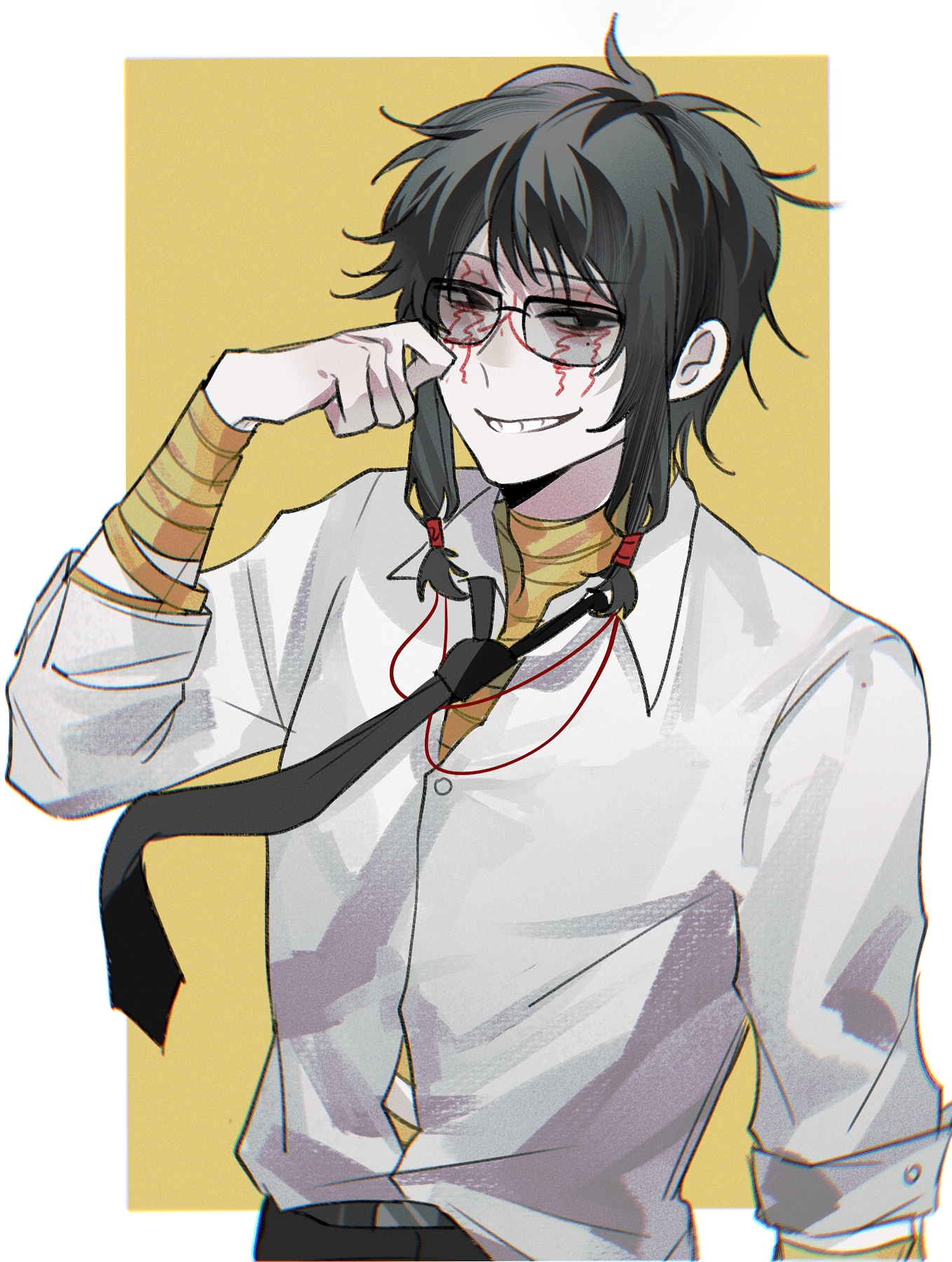 1boy belt black_belt black_eyes black_hair black_necktie black_pants chinese_commentary commentary_request cowboy_shot facial_tattoo floating_neckwear grin highres male_focus mole mole_under_eye necktie pants qijilan shirt short_hair_with_long_locks sleeves_rolled_up smile solo sunglasses tattoo touqi_guaitan white_shirt ziche_fuzhao