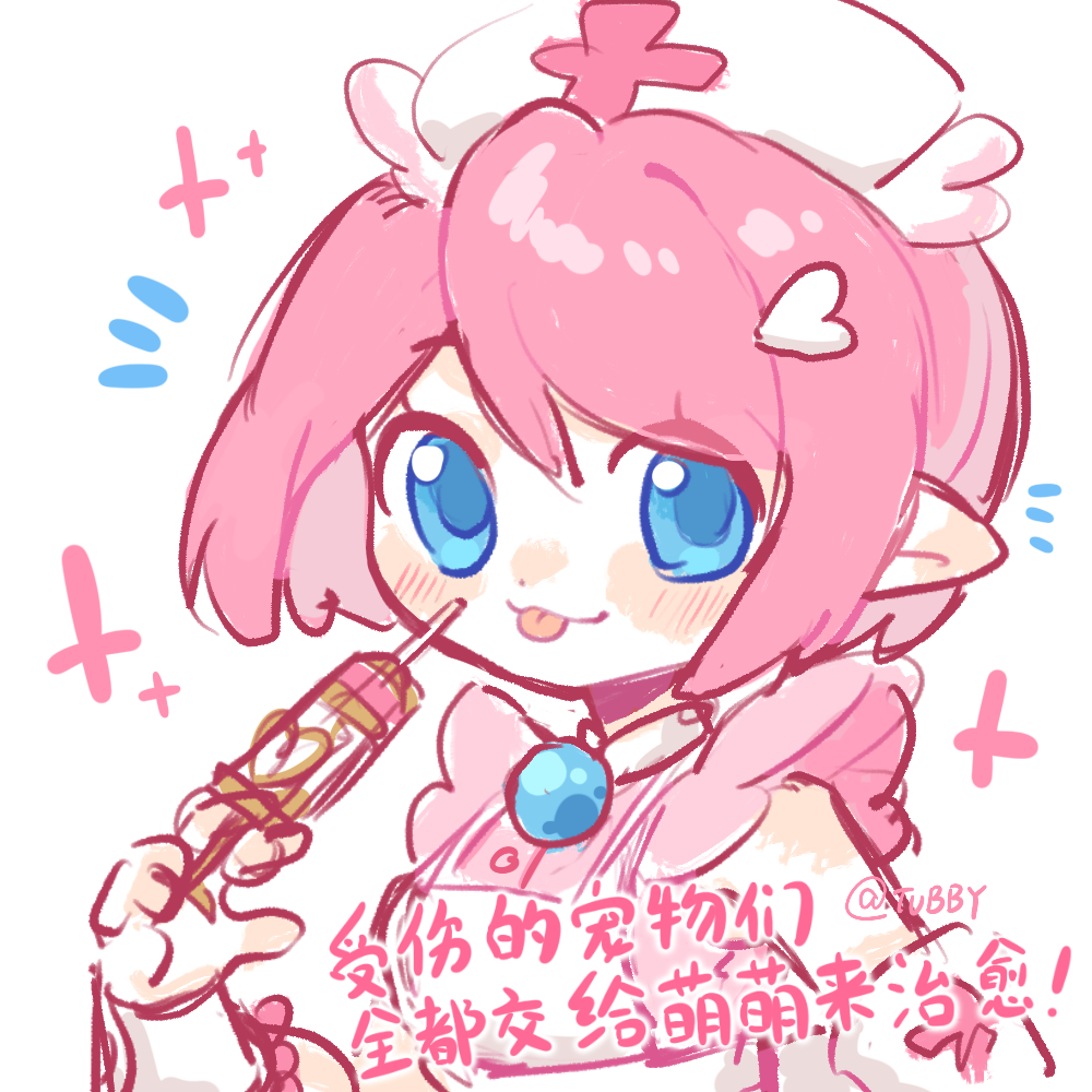 1girl apron armband blue_eyes blush character_request chinese_text commentary cross dress hat holding holding_syringe looking_at_viewer nurse nurse_cap pink_hair pointy_ears red_cross roco_kingdom short_hair shun_zhi_yuanwei_ji sketch smile solo untranslatable_commentary syringe tongue tongue_out translation_request white_background